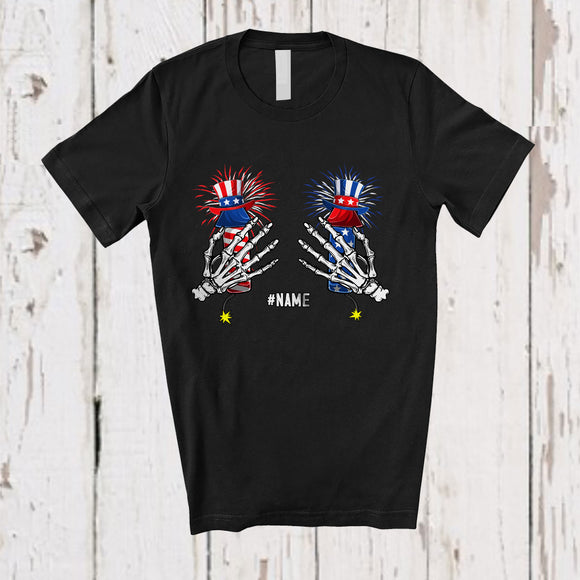 Personalized Two Skeleton Hands On Fireworks; Amazing 4th of July Custom Name Women Family T-Shirt