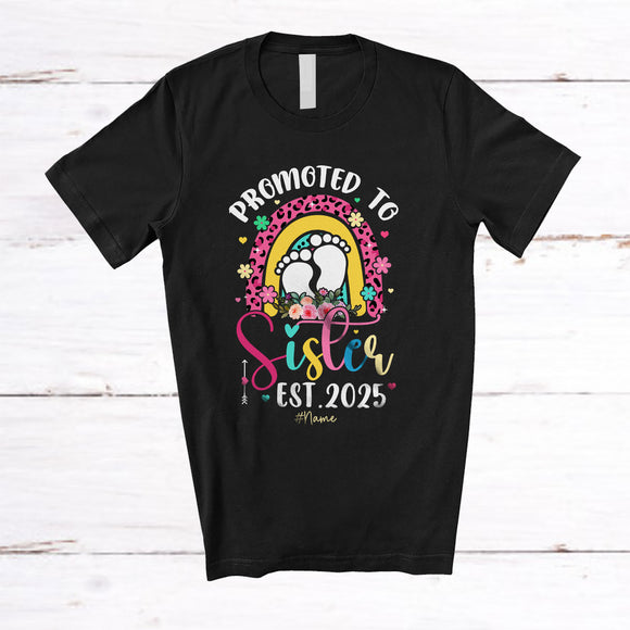Personalized Promoted To Sister Est 2025; Lovely Pregnancy Leopard Rainbow; Custom Name Family T-Shirt