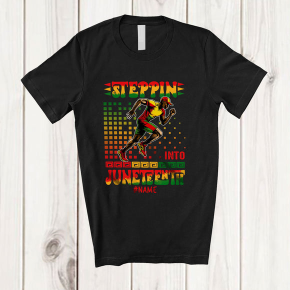 Personalized Steppin into Juneteenth; Amusing Custom Name Black Afro Men Running; African T-Shirt