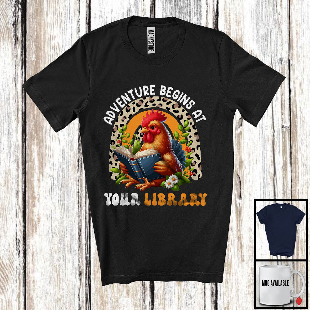 Adventure Begins At Your Library, Adorable Chicken Reading Book, Summer Leopard Rainbow T-Shirt