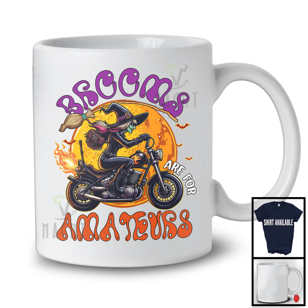 • Brooms Are For Amateurs, Sarcastic Halloween Witch Riding Motorbike Biker, Family Group T-Shirt. This cotton t-shirt is a durable staple product with a classic fit. One of the most popular items, it has a relaxed style made for everyday and casual wear.