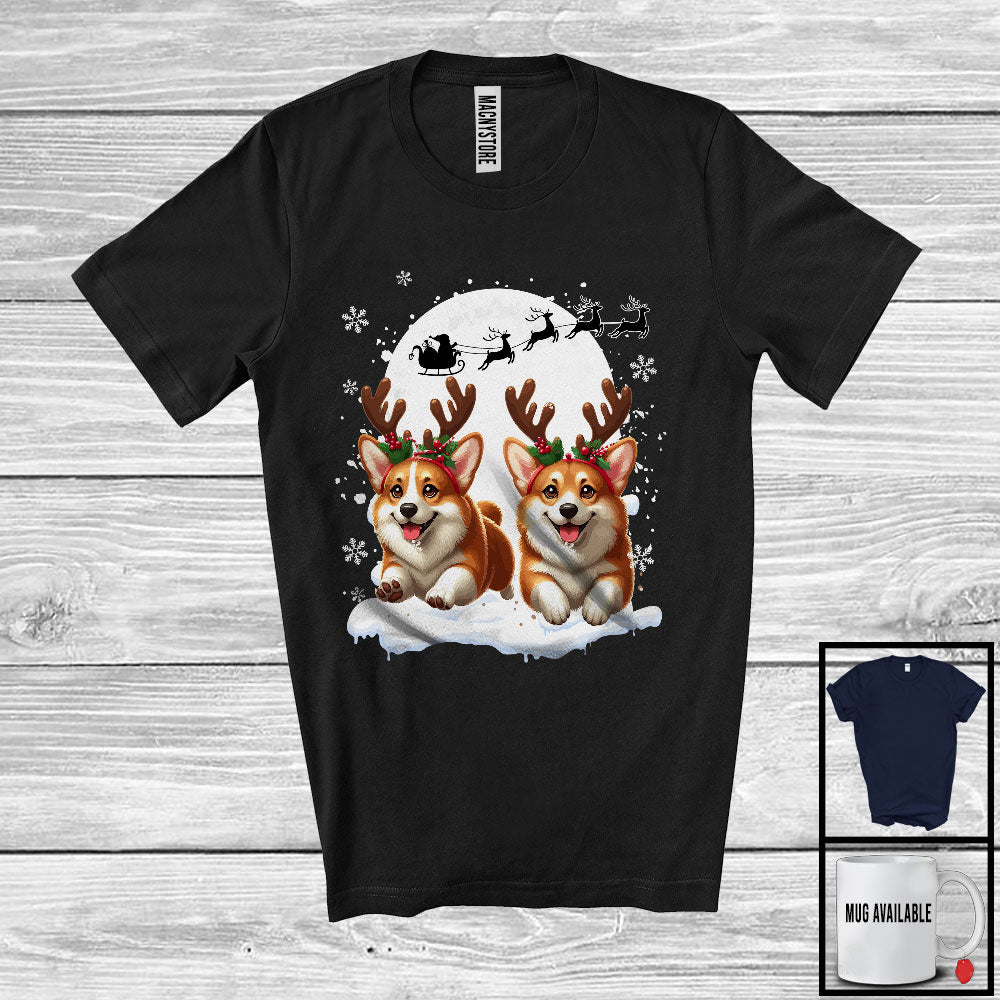 Christmas Two Corgis Reindeer Running; Fantastic X-mas Moon Snowing; Dog Owner Lover T-Shirt