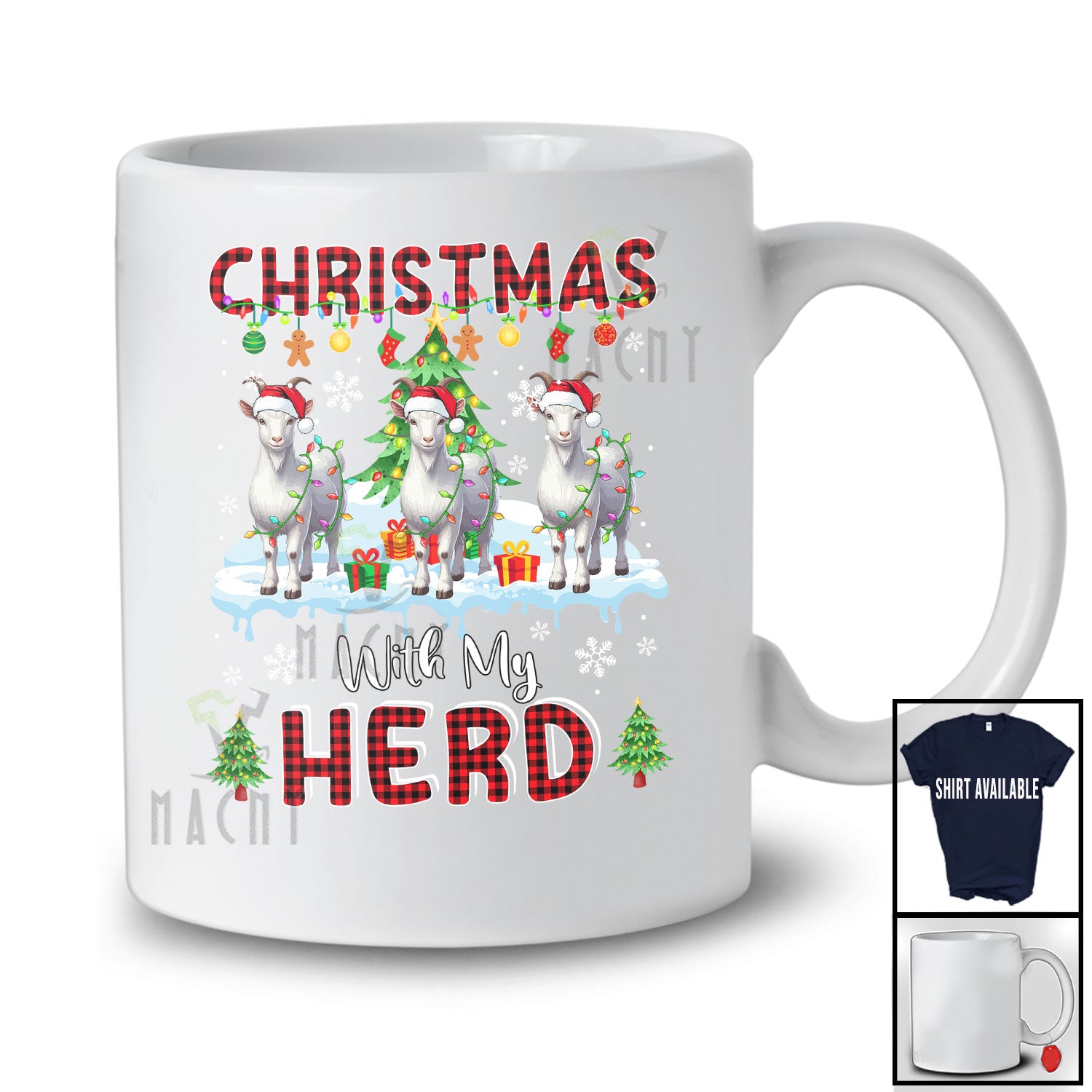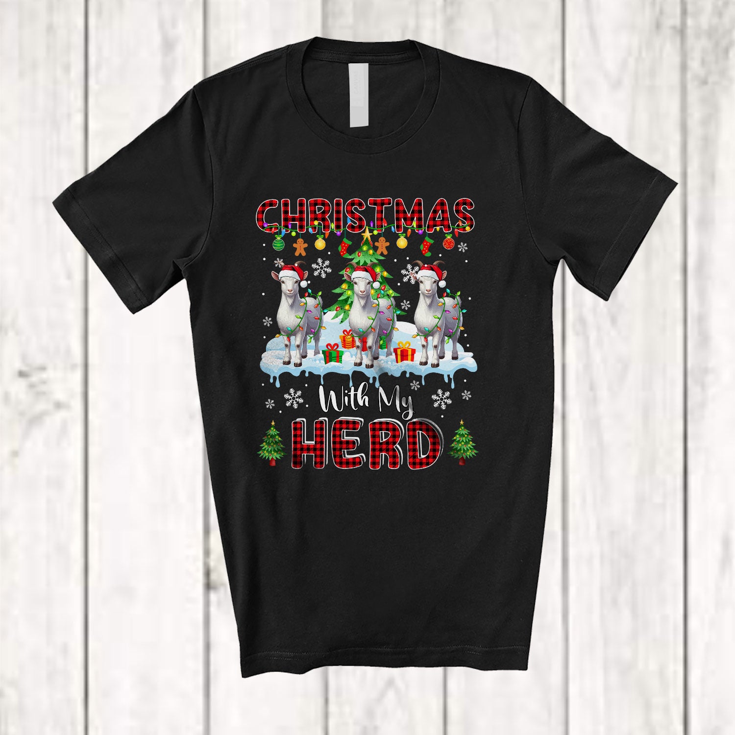 Christmas With My Herd; Fantastic X-mas Tree Snowing Three Santa Goat; Red Plaid Farmer T-Shirt
