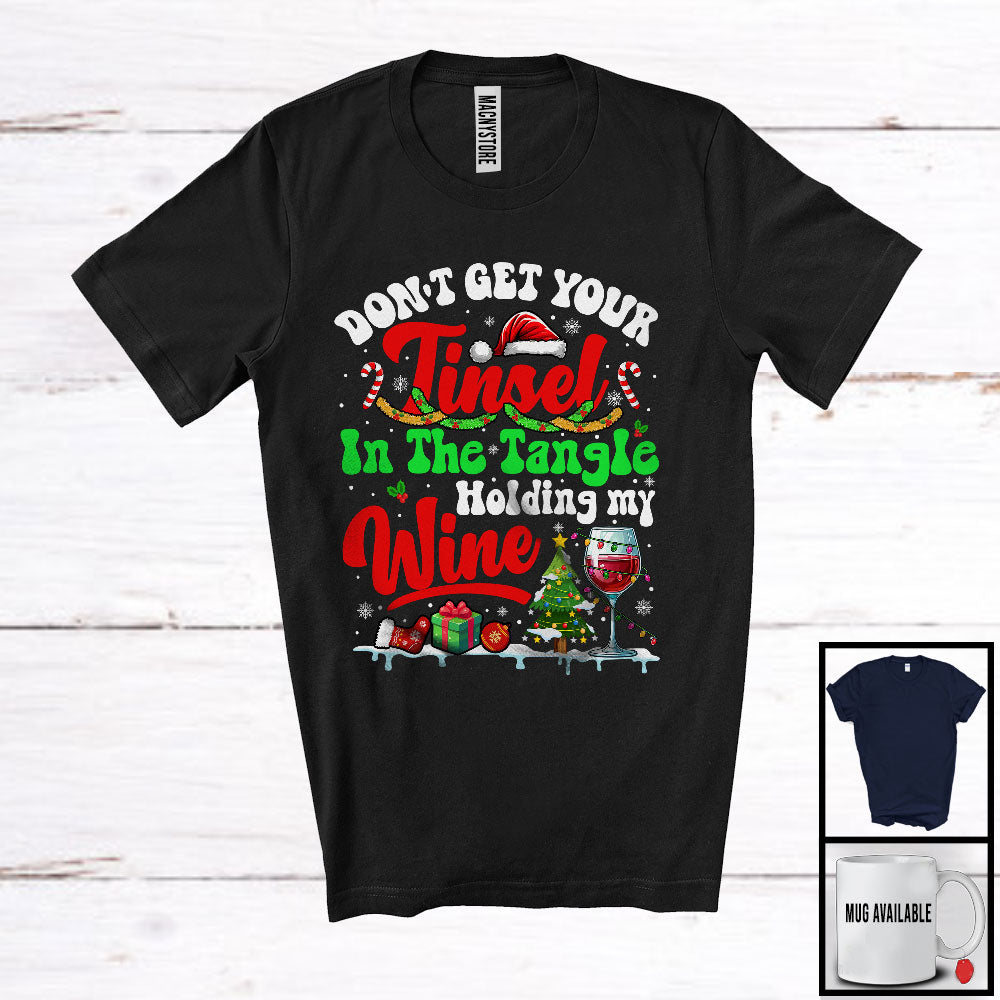• Don't Get Your Tinsel In The Tangle Holding My Wine, Joyful Christmas Santa, Drinking Drunker T-Shirt. This cotton t-shirt is a durable staple product with a classic fit. One of the most popular items, it has a relaxed style made for everyday and casual wear.