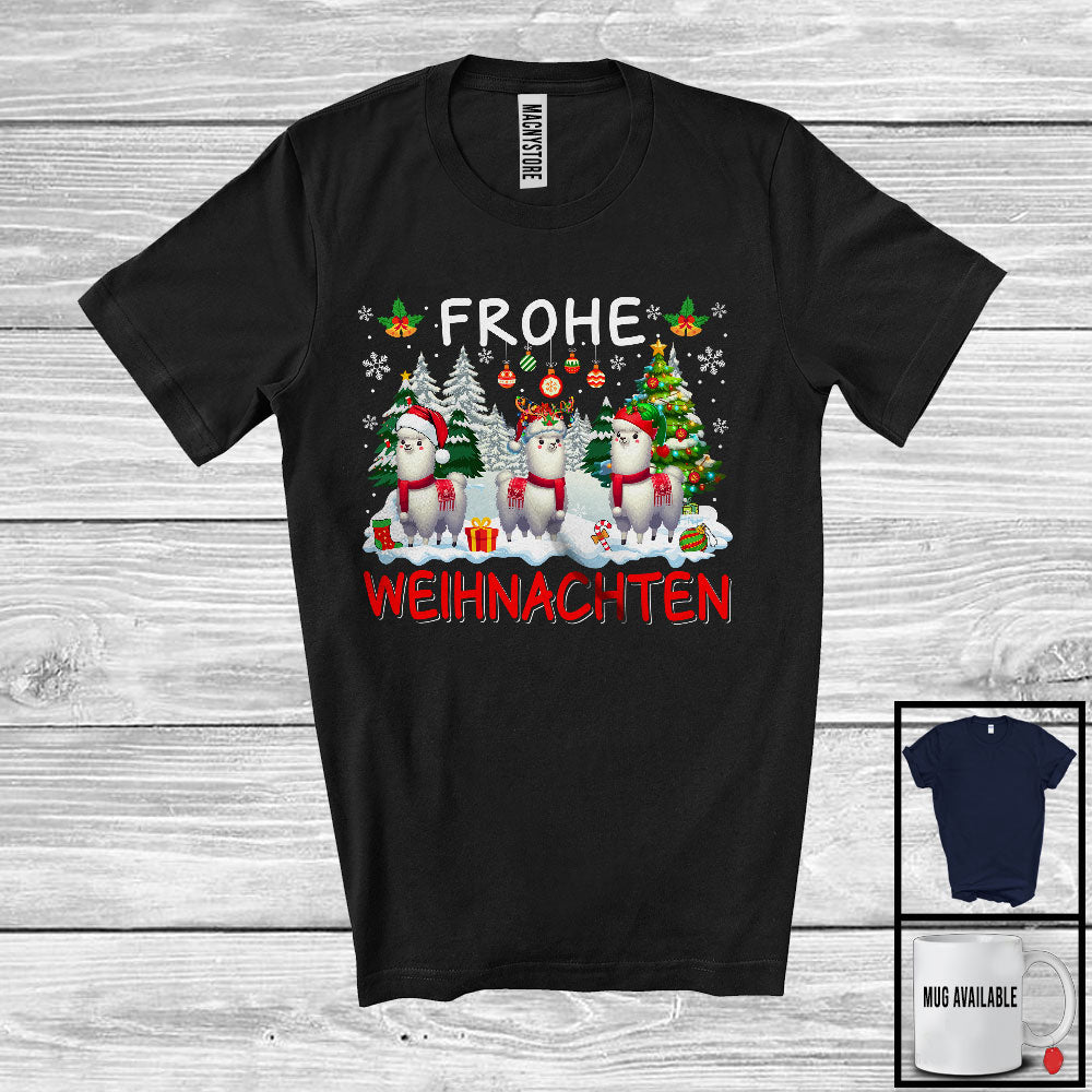 Frohe Weihnachten; Merry Christmas Tree Snowing Three Santa Reindeer Llamas; Germany Family T-Shirt. This cotton t-shirt is a durable staple product with a classic fit. One of the most popular items, it has a relaxed style made for everyday and casual wear.