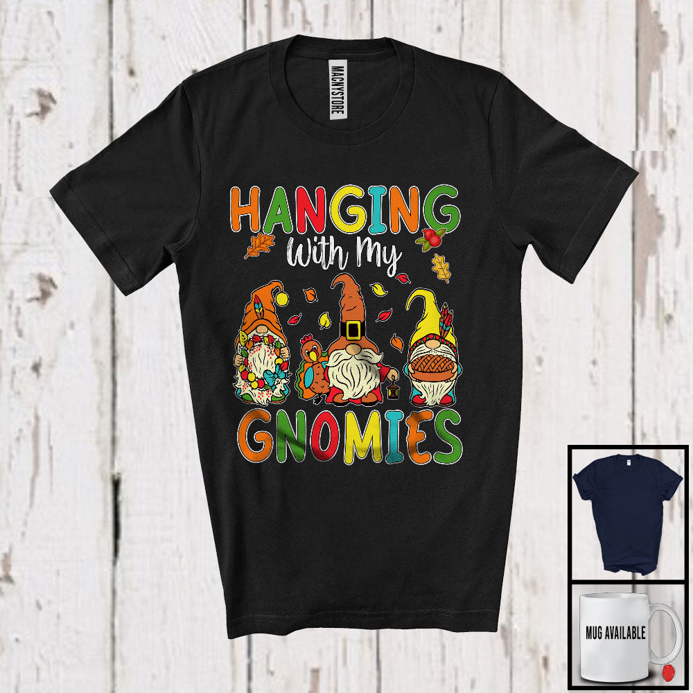 • Hanging With My Gnomies, Adorable Thanksgiving Three Gnomes Squad, Autumn Leaves Family T-Shirt. This cotton t-shirt is a durable staple product with a classic fit. One of the most popular items, it has a relaxed style made for everyday and casual wear.
