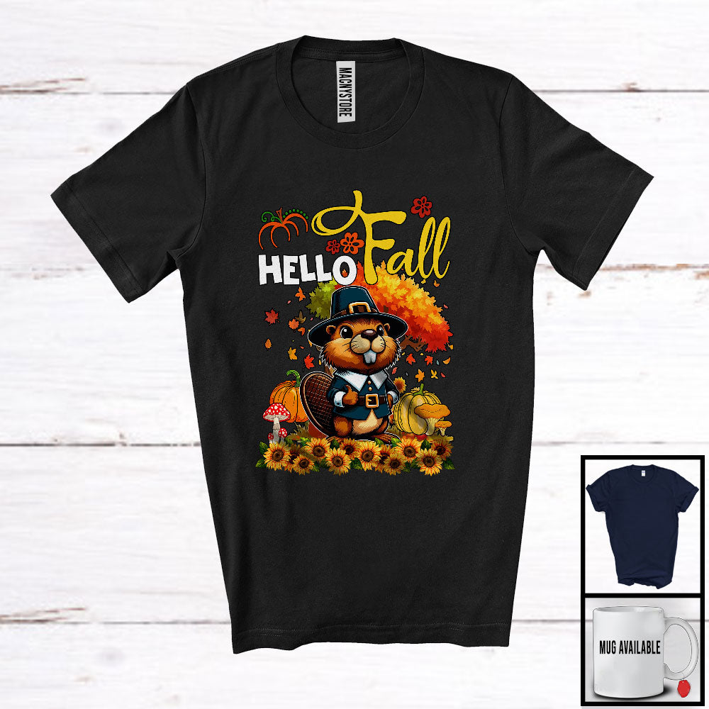 Hello Fall; Lovely Thanksgiving Beaver With Autumn Tree Pumpkin; Animal Lover Family Group T-Shirt