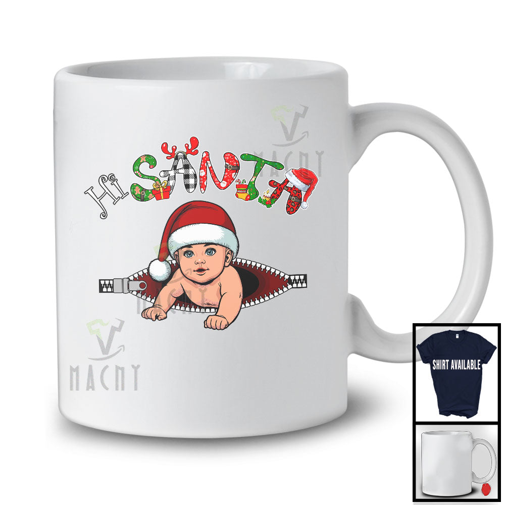 Hi Santa; Adorable Christmas Santa Baby In Zipper Pocket; Pregnancy Announcement Adult Family T-Shirt. This cotton t-shirt is a durable staple product with a classic fit. One of the most popular items, it has a relaxed style made for everyday and casual wear.