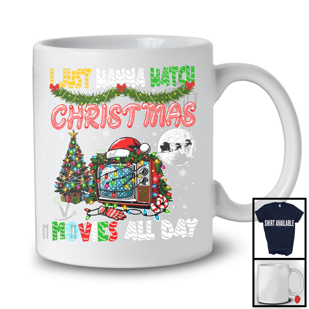 The I Just Wanna Watch Christmas Movies All Day, Humorous X-mas Tree Lights Movie Lover, Family T-Shirt destined to impress, and priced at only $12.95, for a limited time.