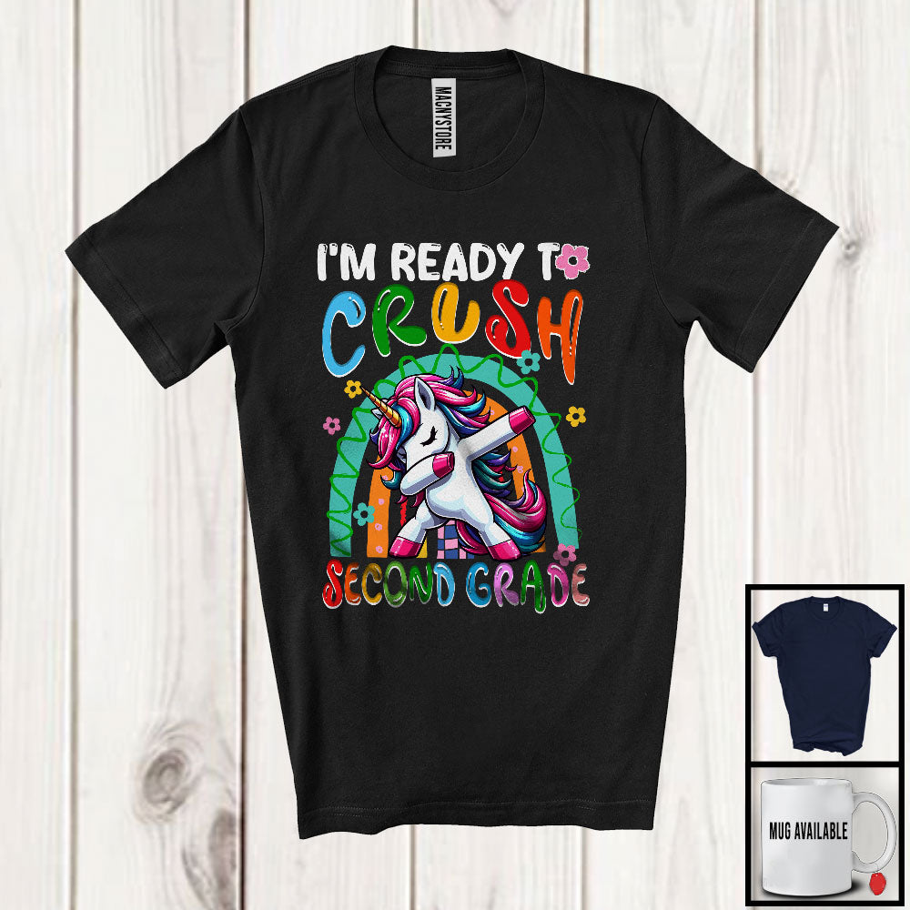• I'm Ready To Crush Second Grade, Adorable First Day Of School Dabbing Unicorn, Rainbow Flowers T-Shirt. This cotton t-shirt is a durable staple product with a classic fit. One of the most popular items, it has a relaxed style made for everyday and casual wear.