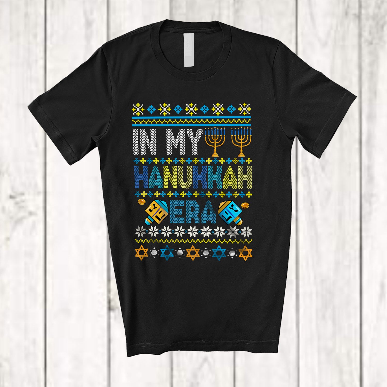 • In My Hanukkah Era; Humorous Hanukkah Sweater Menorah; Matching Family Friends Group T-Shirt. This cotton t-shirt is a durable staple product with a classic fit. One of the most popular items, it has a relaxed style made for everyday and casual wear.