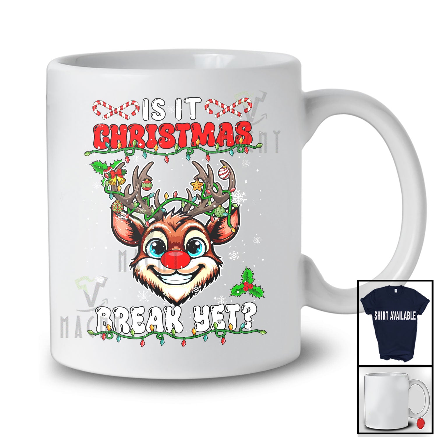 • Is It Christmas Break Yet; Humorous Christmas Lights Reindeer Face; Vacation X-mas Teacher Group T-Shirt. This cotton t-shirt is a durable staple product with a classic fit. One of the most popular items, it has a relaxed style made for everyday and casual wear.