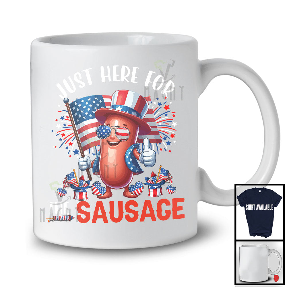 • Just Here For The Sausage, Awesome 4th Of July American Flag Fireworks, Patriotic Food Lover T-Shirt. This cotton t-shirt is a durable staple product with a classic fit. One of the most popular items, it has a relaxed style made for everyday and casual wear.