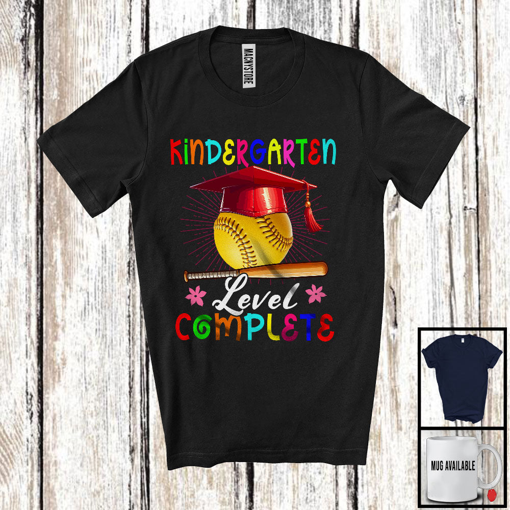 Kindergarten Level Complete, Joyful Last Day Of School Softball Player Playing, Girls Students Group T-Shirt. This cotton t-shirt is a durable staple product with a classic fit. One of the most popular items, it has a relaxed style made for everyday and casual wear.