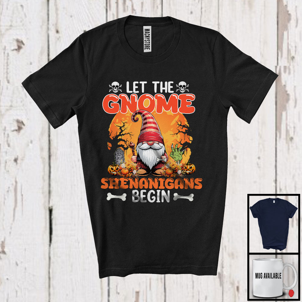 • Let The Gnome Shenanigans Begin, Awesome Halloween Moon Gnome, Zombie Hand Pumpkins T-Shirt. This cotton t-shirt is a durable staple product with a classic fit. One of the most popular items, it has a relaxed style made for everyday and casual wear.