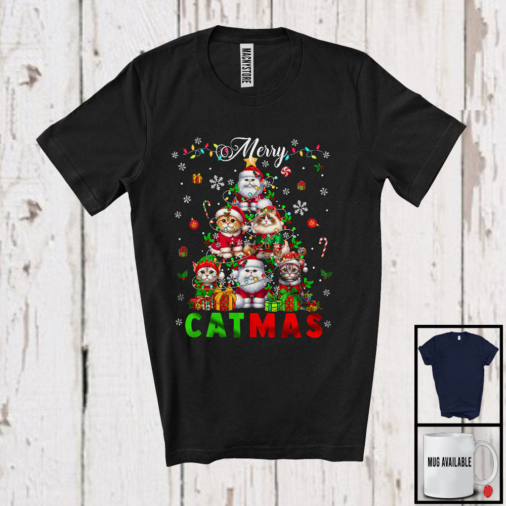 Merry Catmas; Humorous Christmas Reindeer Elf Santa Cat Christmas Tree; X-mas Animal Lover T-Shirt