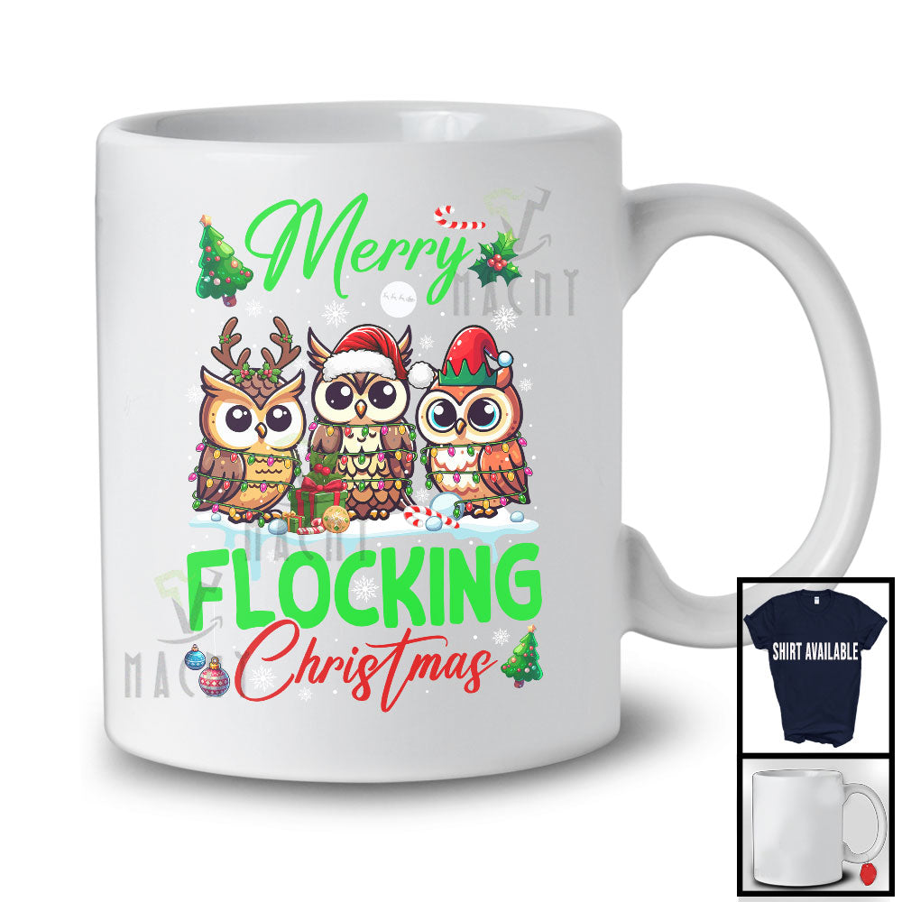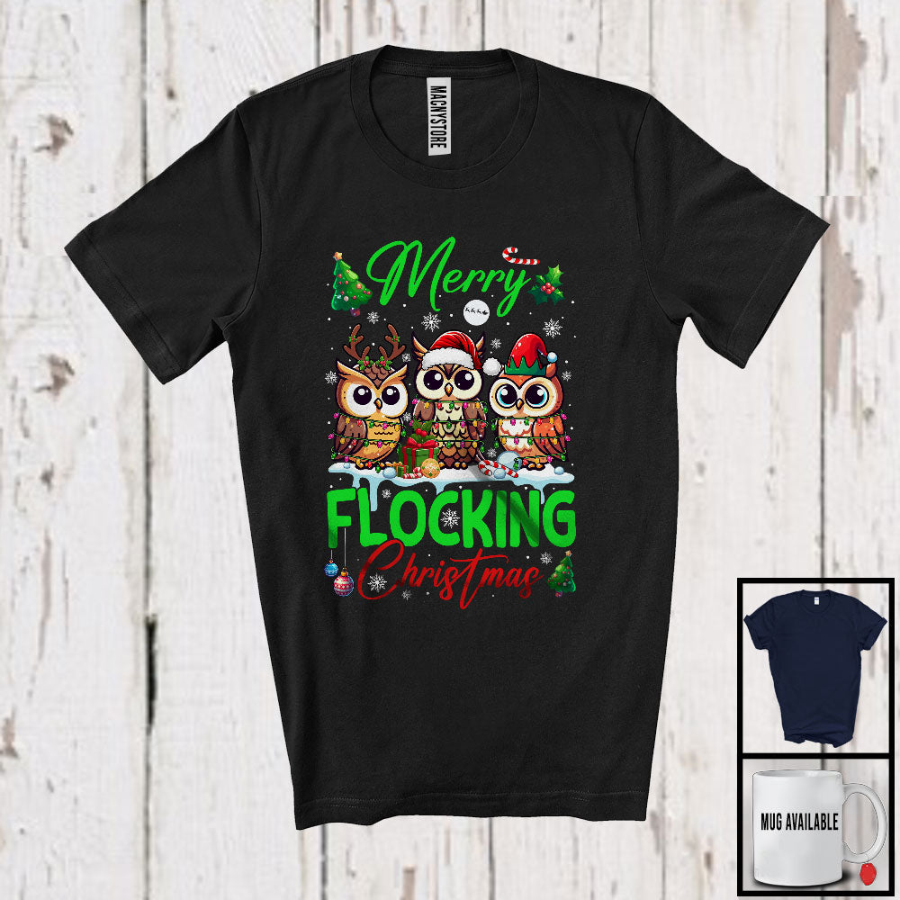 Merry Flocking Christmas; Amazing X-mas Three Santa ELF Reindeer Owl; Bird Lover Family T-Shirt