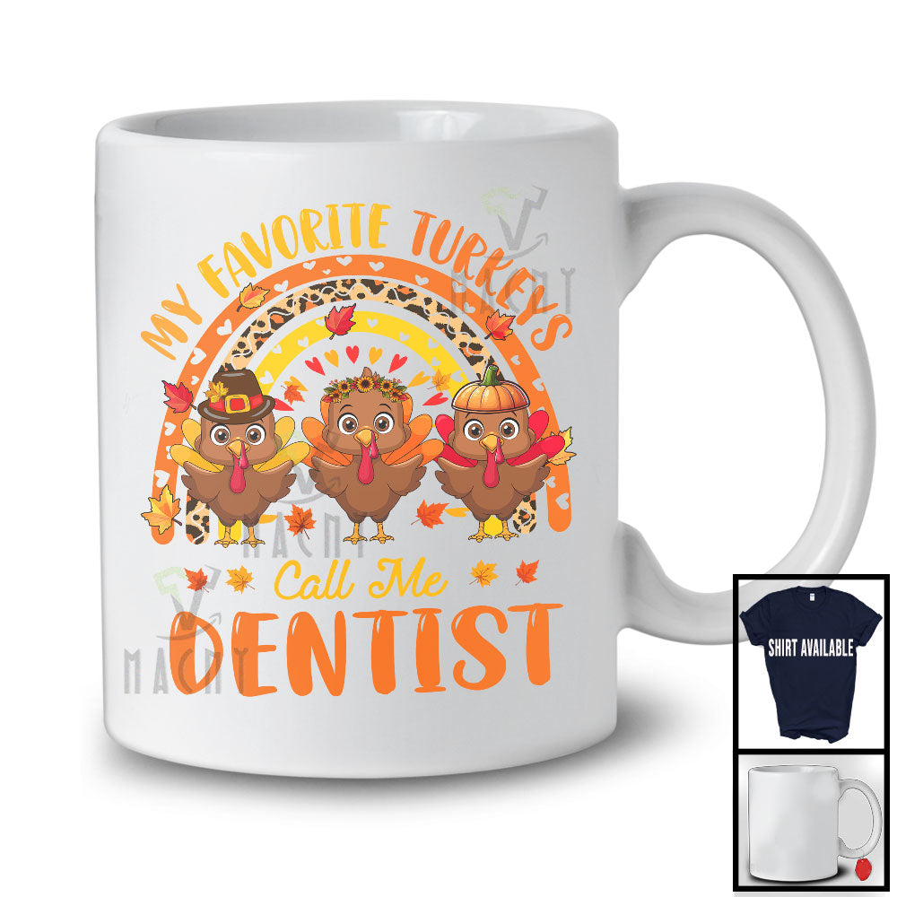 My Favorite Turkeys Call Me Dentist; Happy Thanksgiving Leopard Rainbow; Three Turkeys T-Shirt. This cotton t-shirt is a durable staple product with a classic fit. One of the most popular items, it has a relaxed style made for everyday and casual wear.