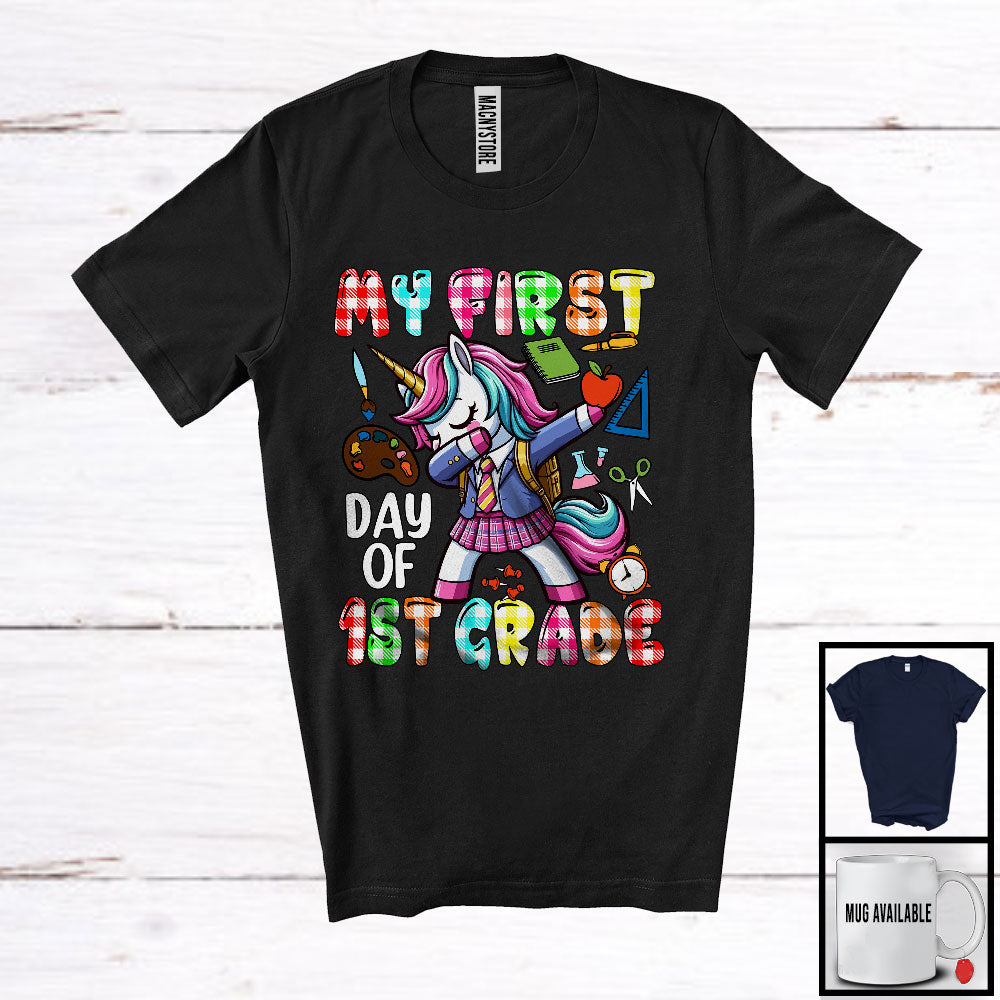 My First Day Of First Grade, Adorable Back To School Plaid Unicorn Dabbing, Girls Students T-Shirt