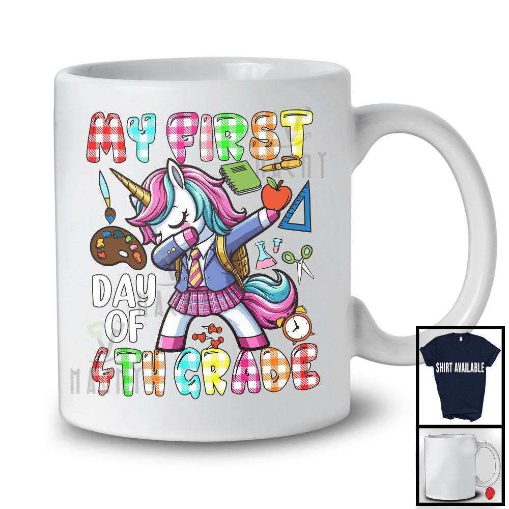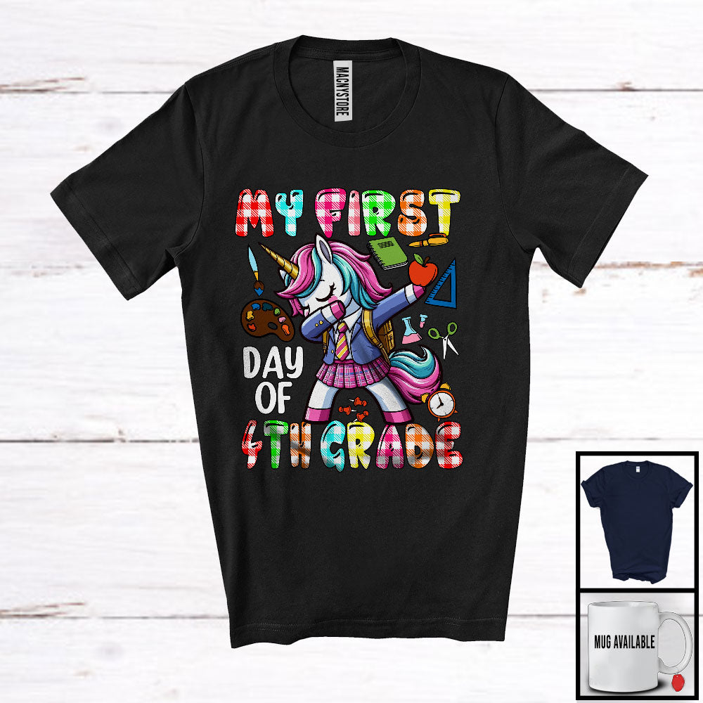 My First Day Of Fourth Grade, Adorable Back To School Plaid Unicorn Dabbing, Girls Students T-Shirt