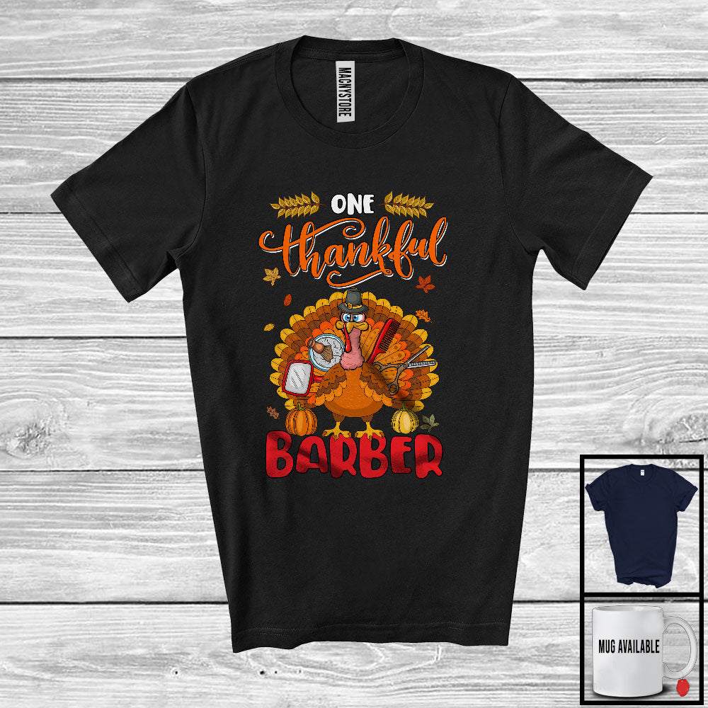 This One Thankful Barber; Humorous Thanksgiving Turkey Autumn Leaves; Barber Group T-Shirt is great idea gift for your family, friends in this birthday, christmas, mother's day, father's day, patrick's day or any holiday.