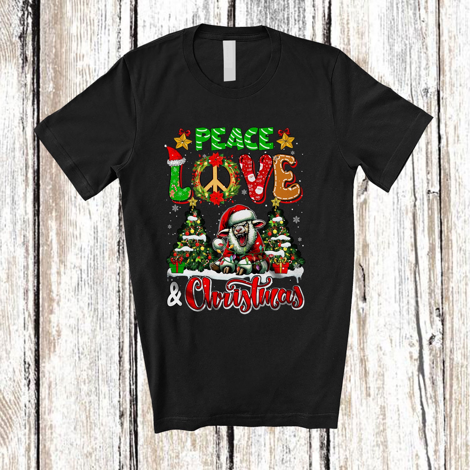 new MacnyStore - Peace Love And Christmas; Fantastic X-mas Trees Lights Sheep Santa; Farmer Farm Animal T-Shirt – Macnystore
