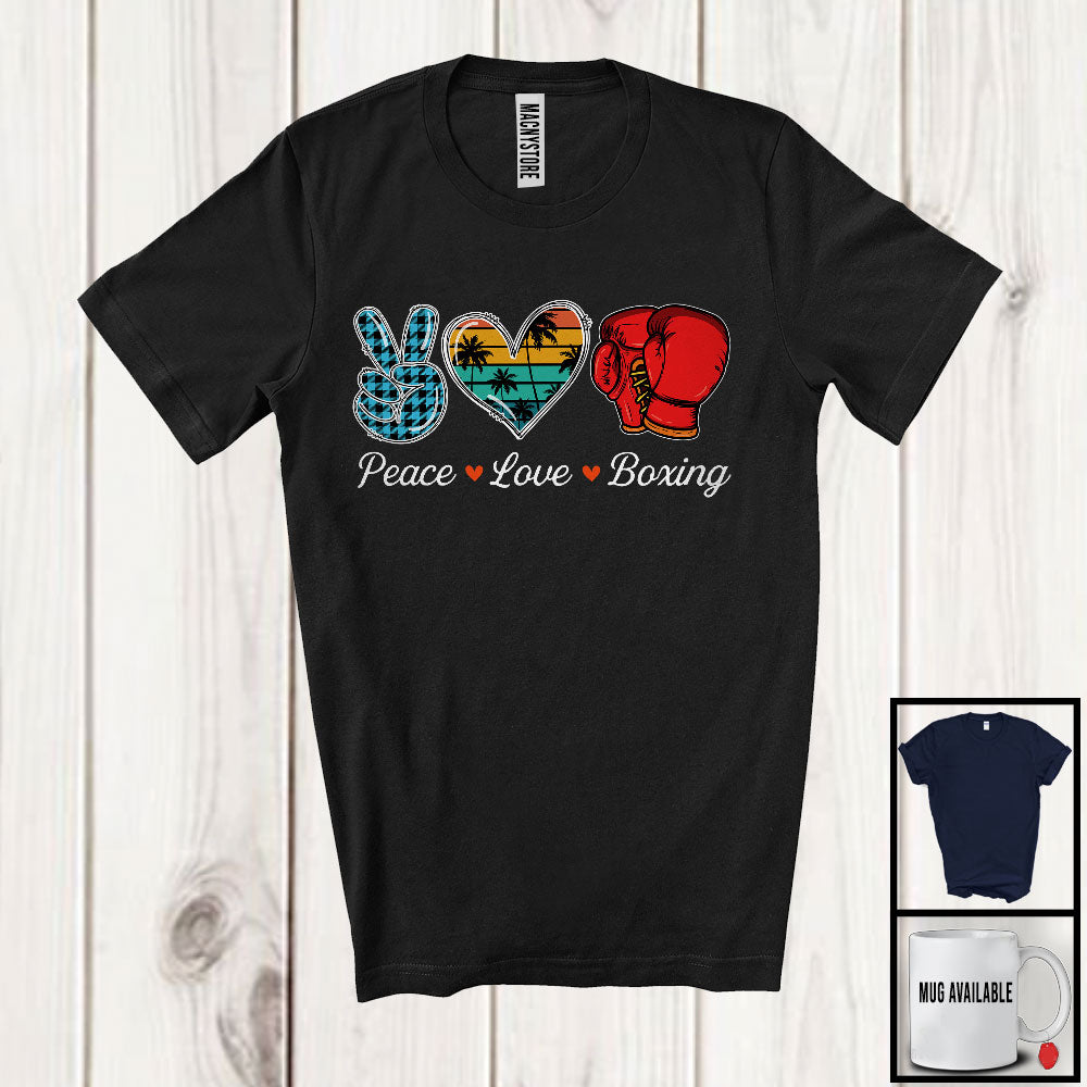 Peace Love Boxing, Adorable Peace Hand Sign Plaid Retro Heart, Boxing Player Matching Team T-Shirt. This cotton t-shirt is a durable staple product with a classic fit. One of the most popular items, it has a relaxed style made for everyday and casual wear.