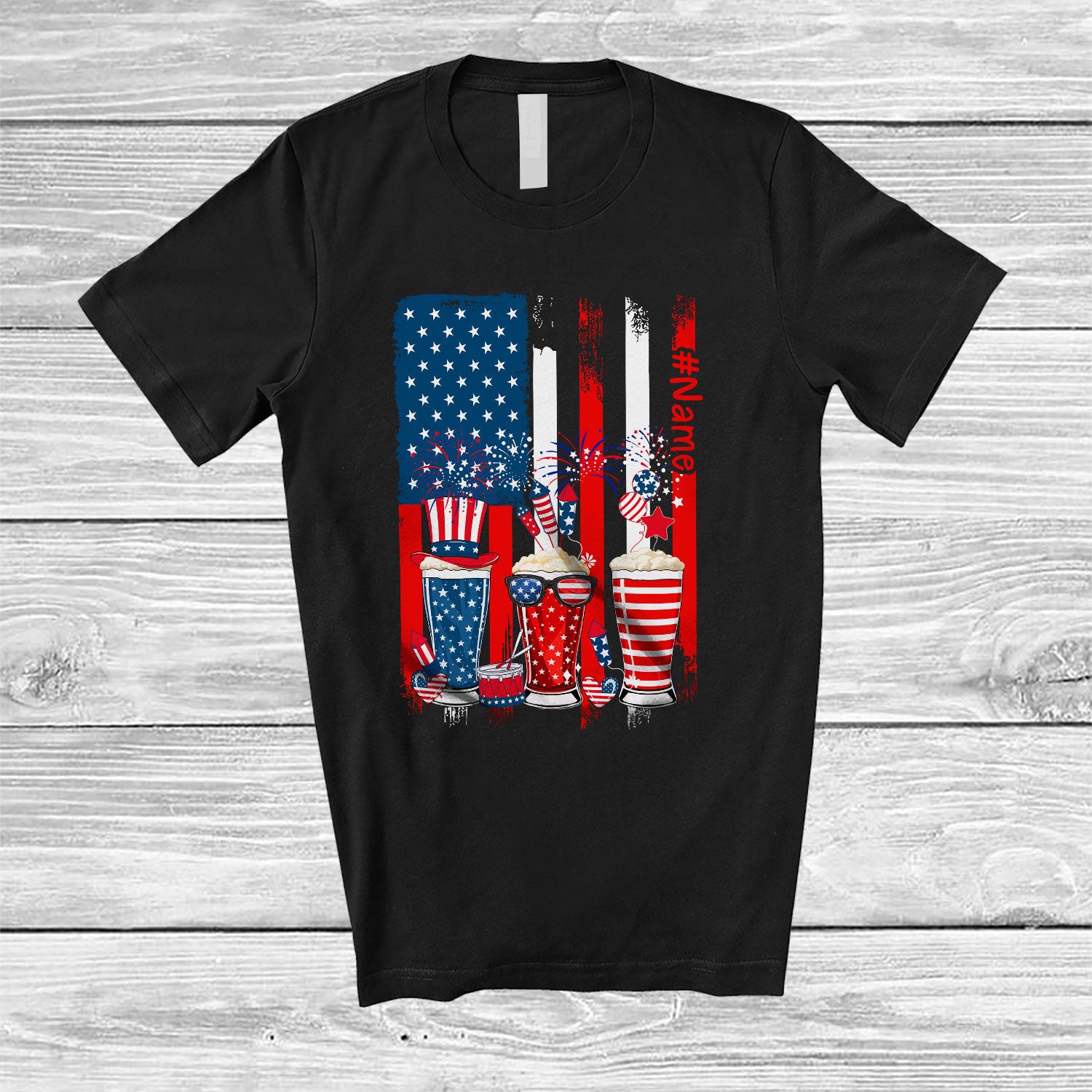 Personalized Beer American Flag; Awesome 4th of July Custom Name Drinking Drunker; Patriotic T-Shirt. This cotton t-shirt is a durable staple product with a classic fit. One of the most popular items, it has a relaxed style made for everyday and casual wear.