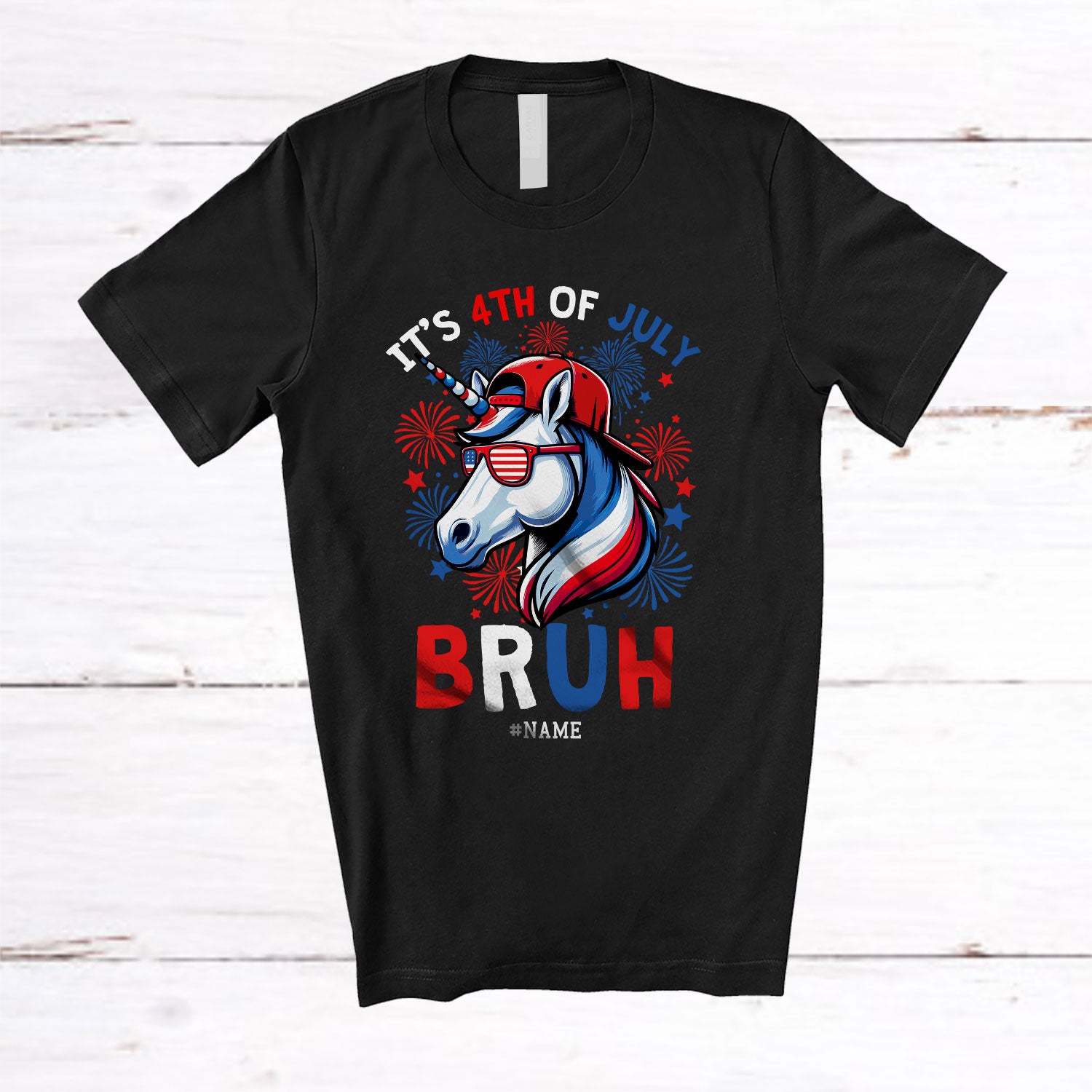 Personalized Bruh It's 4th Of July; Lovely Custom Name Unicorn American Flag Fireworks; Patriotic T-Shirt. This cotton t-shirt is a durable staple product with a classic fit. One of the most popular items, it has a relaxed style made for everyday and casual wear.