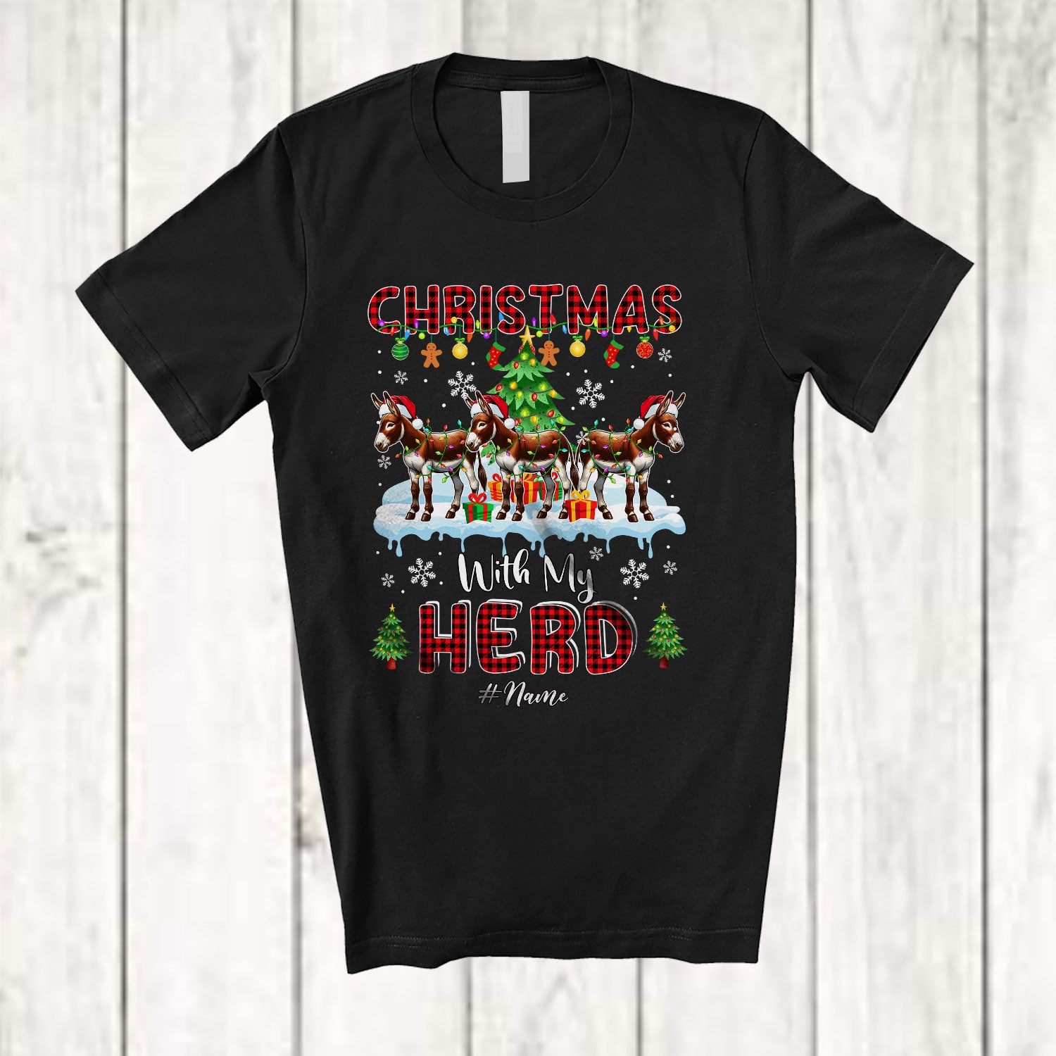 Personalized Christmas With My Herd; Fantastic X-mas Plaid Three Santa Donkey; Custom Name Farmer T-Shirt