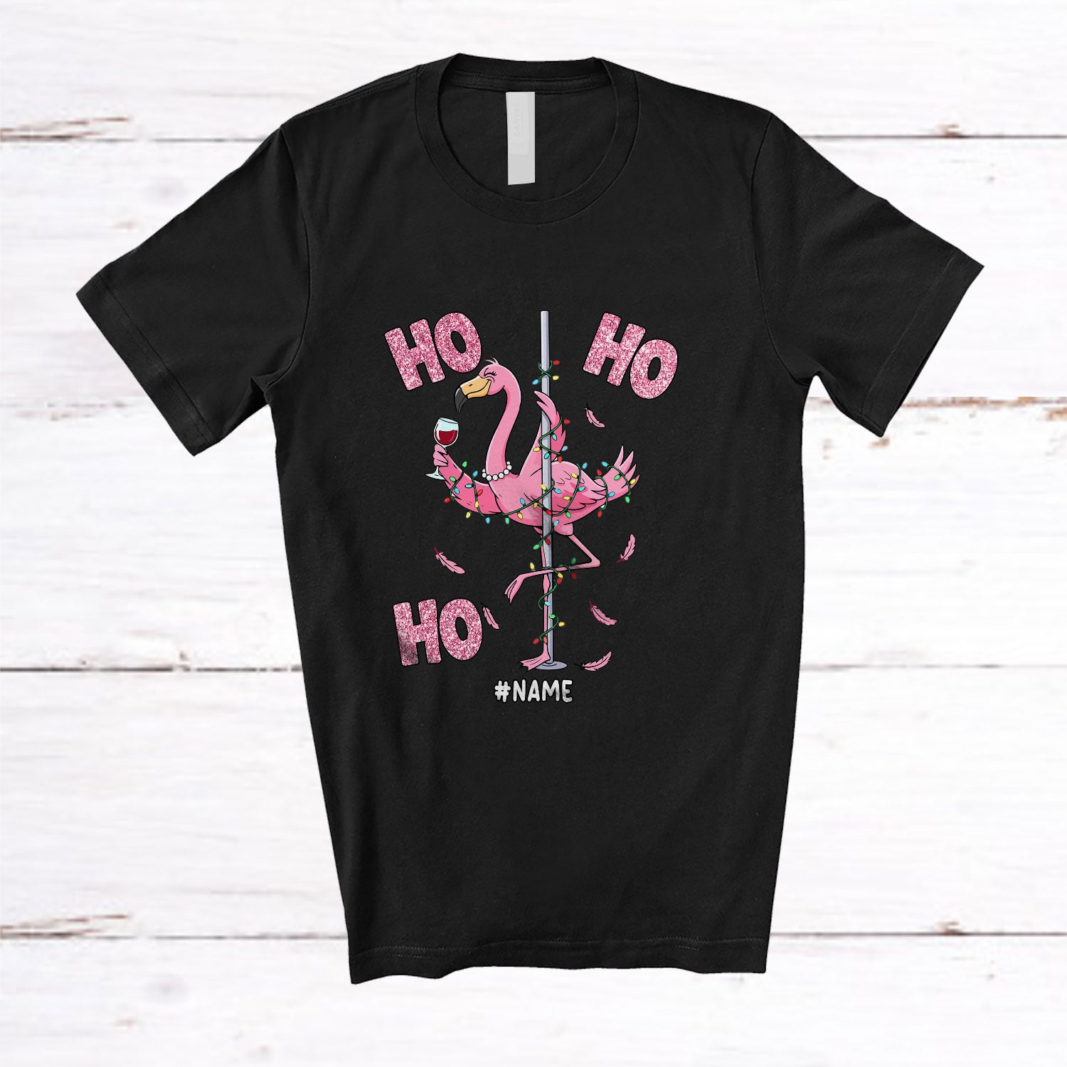 Personalized Custom Name 3Ho; Sarcastic Christmas Lights Flamingo Dancing Dancer Drinking Wine T-Shirt. This cotton t-shirt is a durable staple product with a classic fit. One of the most popular items, it has a relaxed style made for everyday and casual wear.