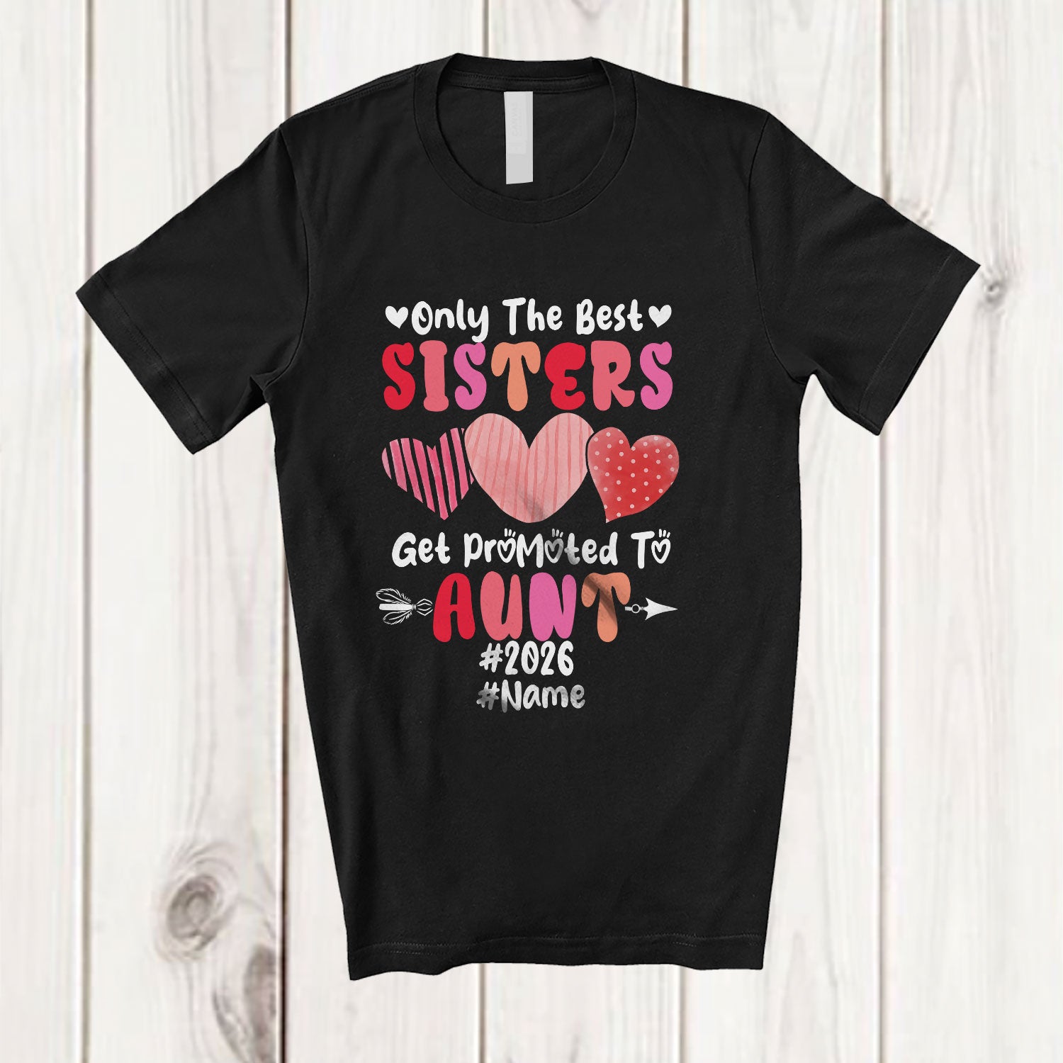 Personalized Custom Name Best Sisters Promoted To Aunt 2026; Happy Mother's Day Hearts T-Shirt. This cotton t-shirt is a durable staple product with a classic fit. One of the most popular items, it has a relaxed style made for everyday and casual wear.