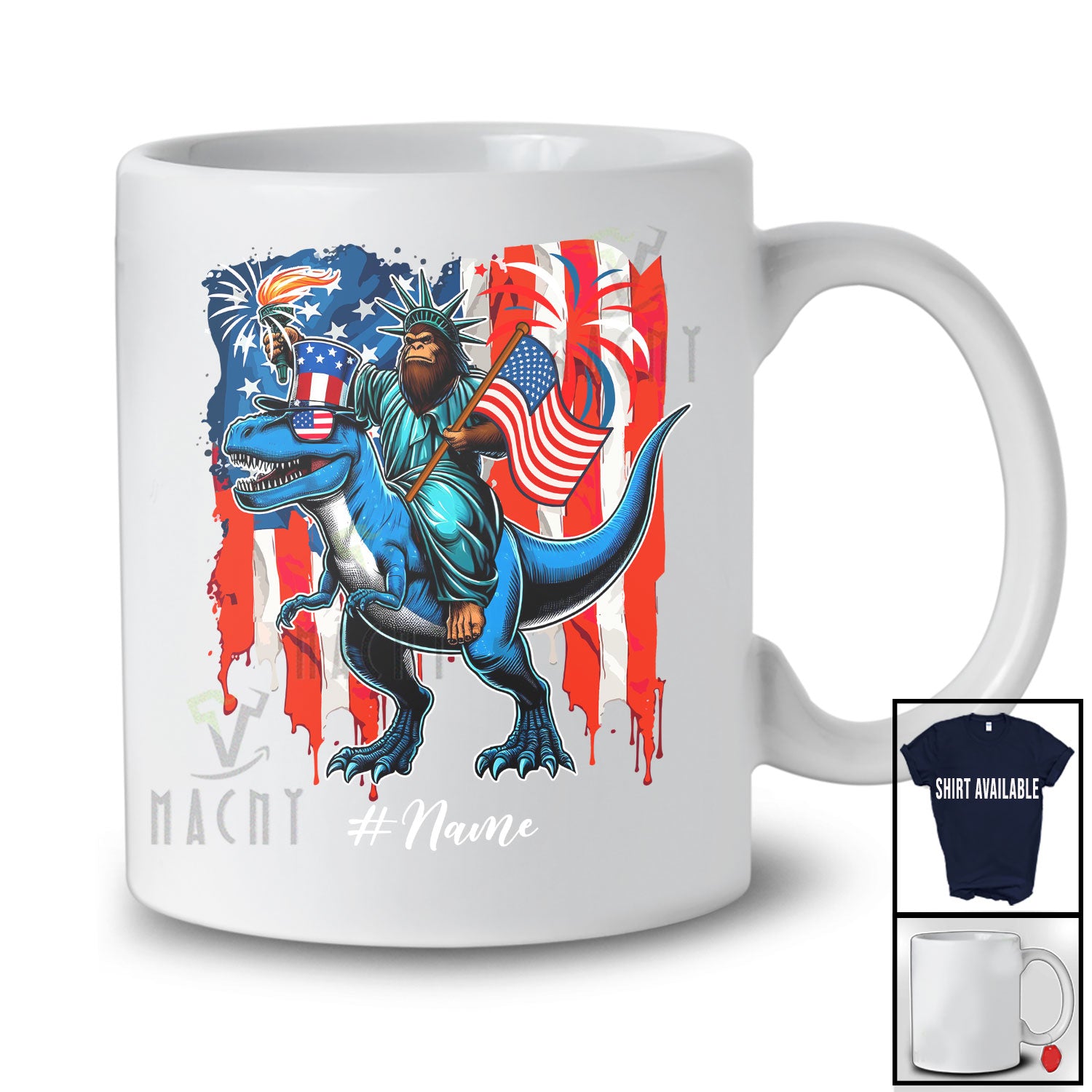 new MacnyStore - Personalized Custom Name Bigfoot Liberty Riding T-Rex; Proud 4th Of July US Flag; Patriotic T-Shirt – Macnystore