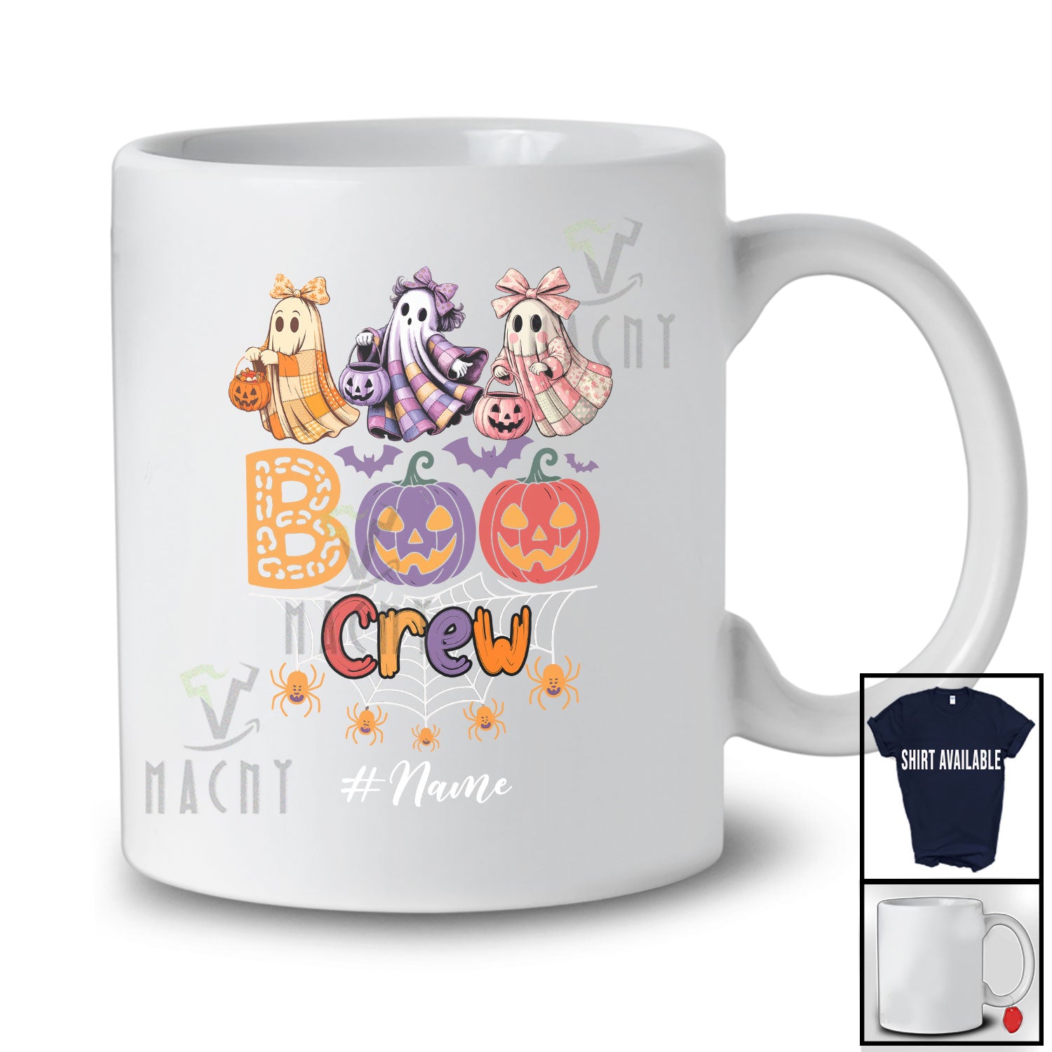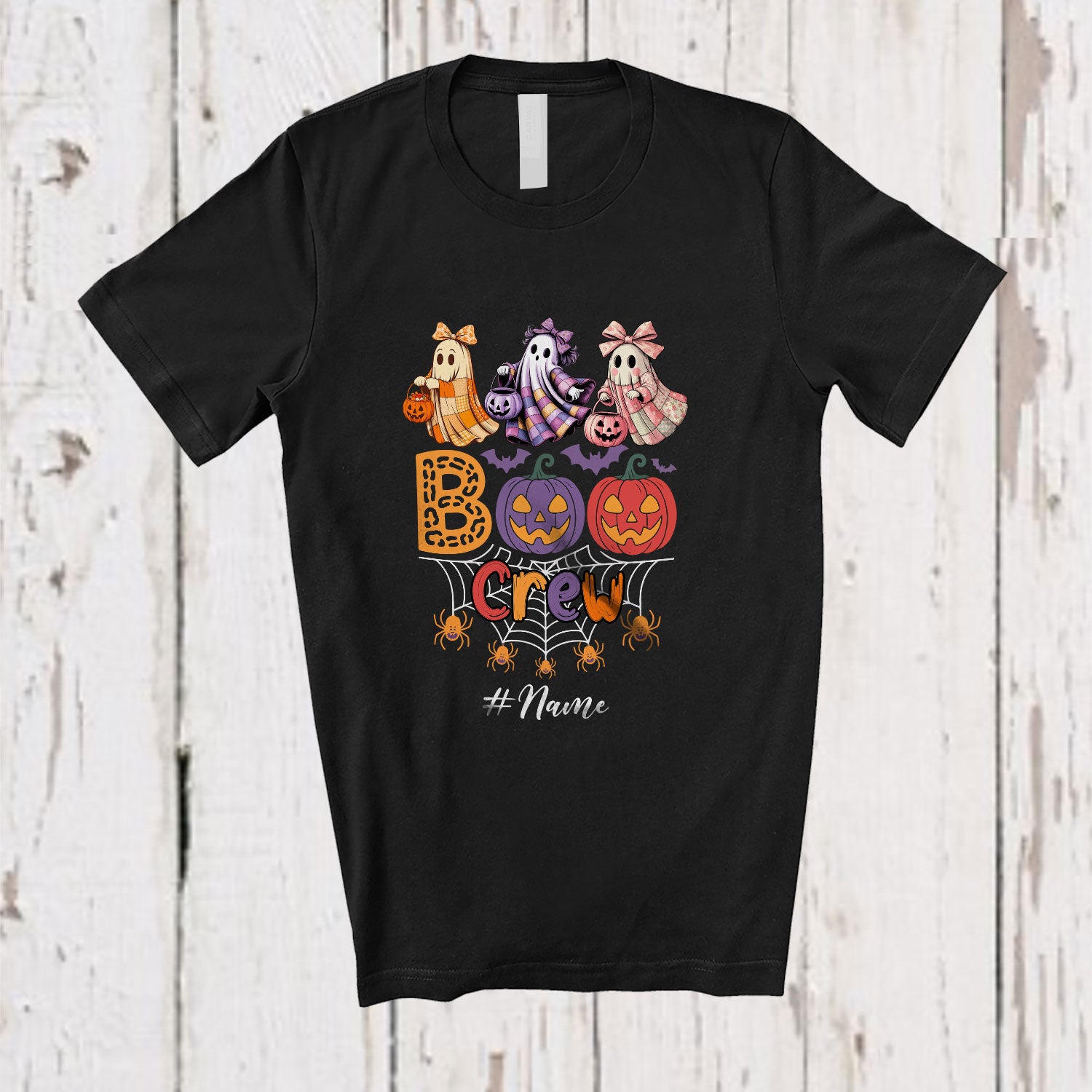 Personalized Custom Name Boo Crew; Horror Halloween Three Ghost Bow Tie; Family T-Shirt. This cotton t-shirt is a durable staple product with a classic fit. One of the most popular items, it has a relaxed style made for everyday and casual wear.