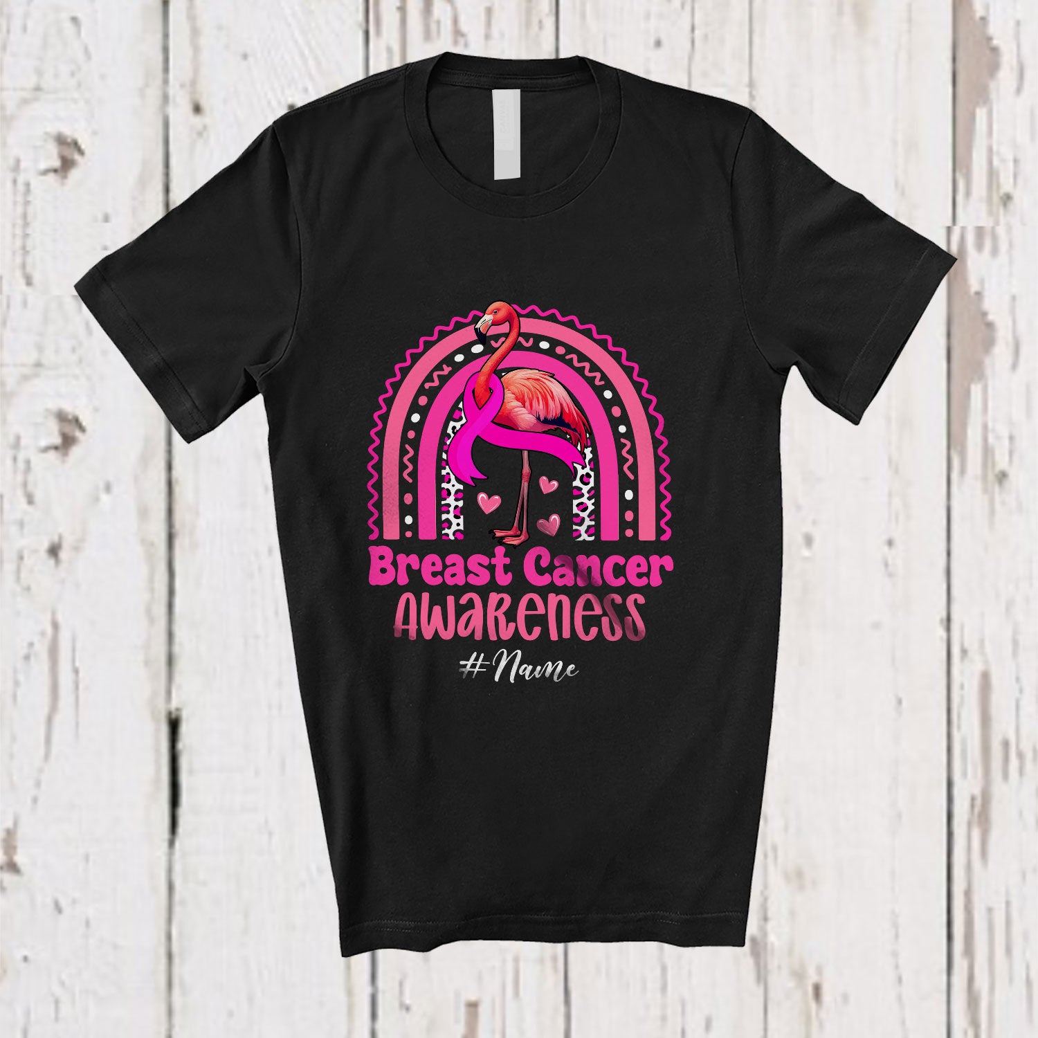 Personalized Custom Name Breast Cancer; Lovely Pink Ribbon Flamingo Rainbow T-Shirt