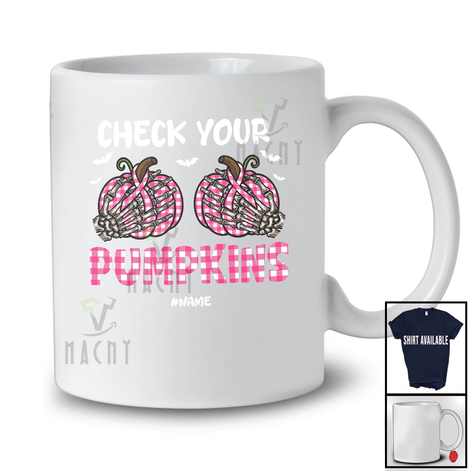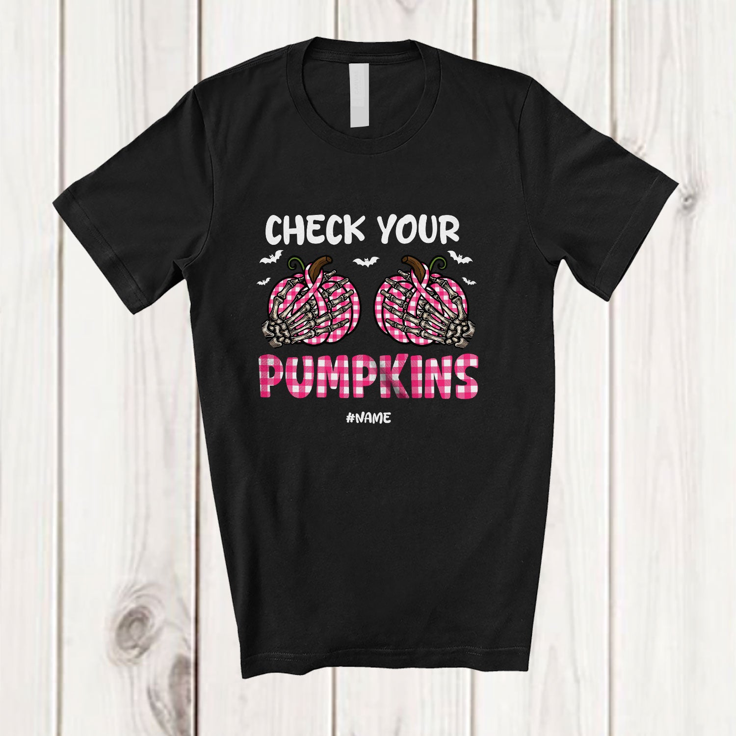 Personalized Custom Name Check Your Pumpkins; Scary Breast Cancer Halloween Pink Skeleton Hands T-Shirt. This cotton t-shirt is a durable staple product with a classic fit. One of the most popular items, it has a relaxed style made for everyday and casual wear.