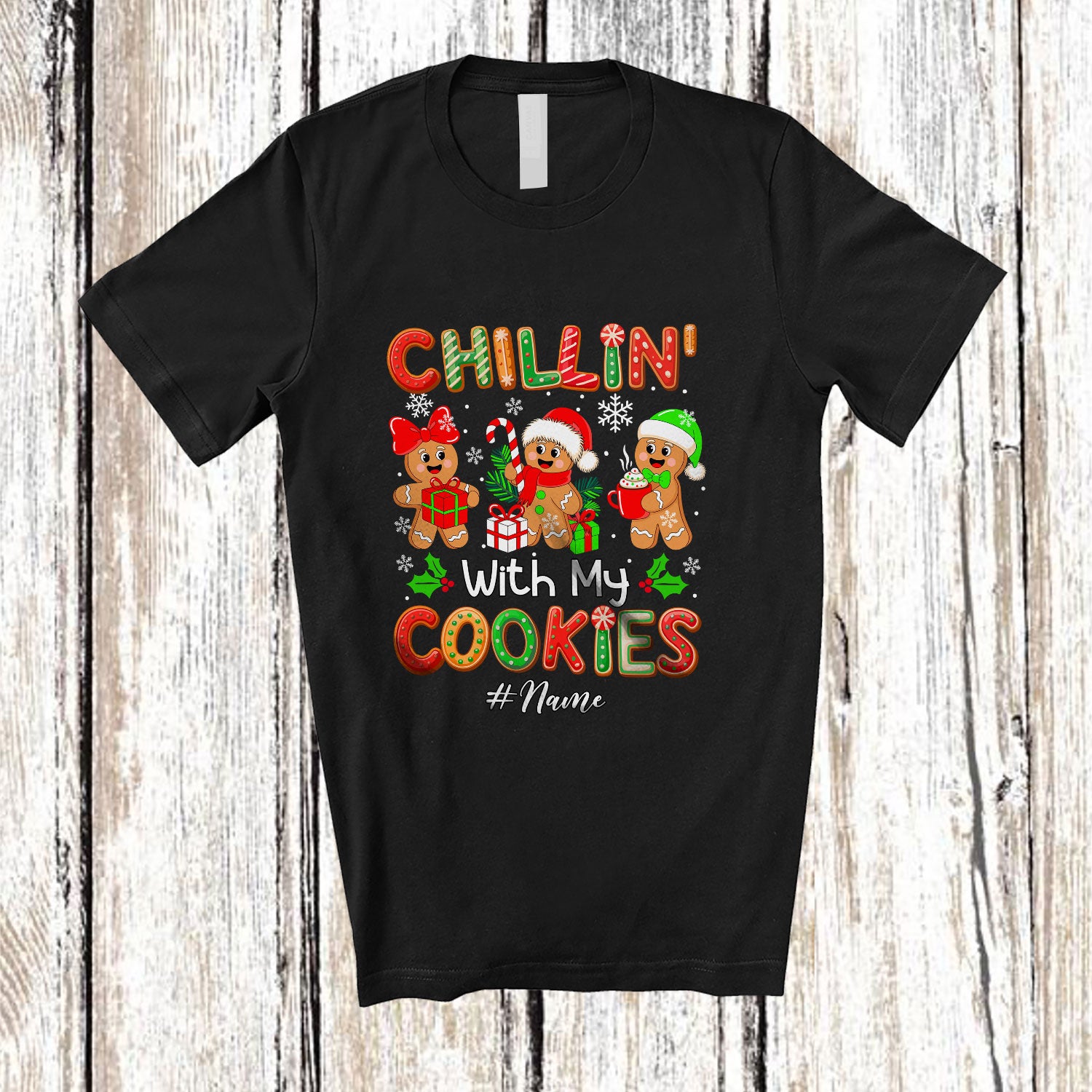 Personalized Custom Name Chillin' With My Cookies; Amazing Christmas Three X-mas Gingerbreads T-Shirt. This cotton t-shirt is a durable staple product with a classic fit. One of the most popular items, it has a relaxed style made for everyday and casual wear.