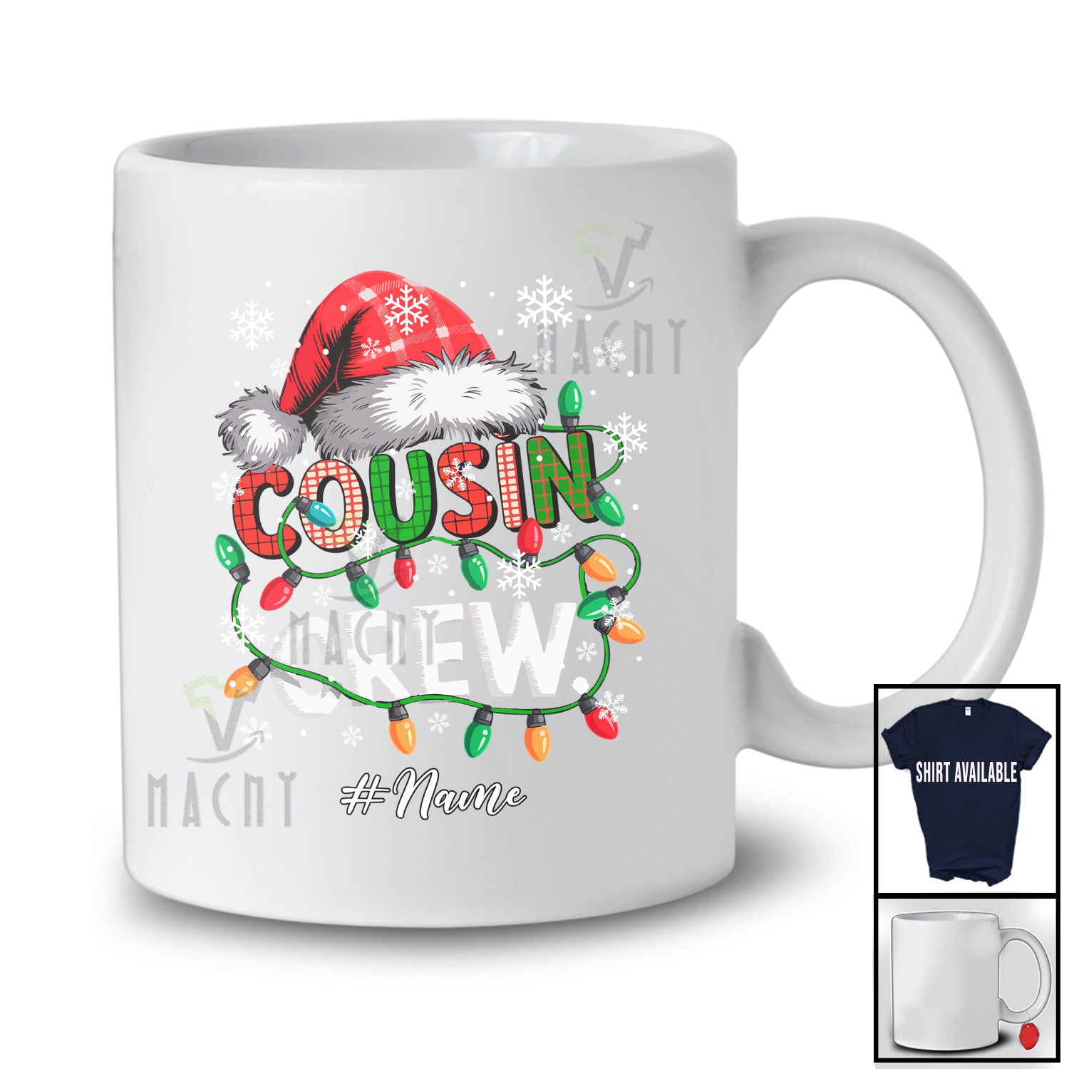 Personalized Custom Name Cousin Crew; Merry Christmas Lights Plaid Santa; Snow Family T-Shirt. This cotton t-shirt is a durable staple product with a classic fit. One of the most popular items, it has a relaxed style made for everyday and casual wear.