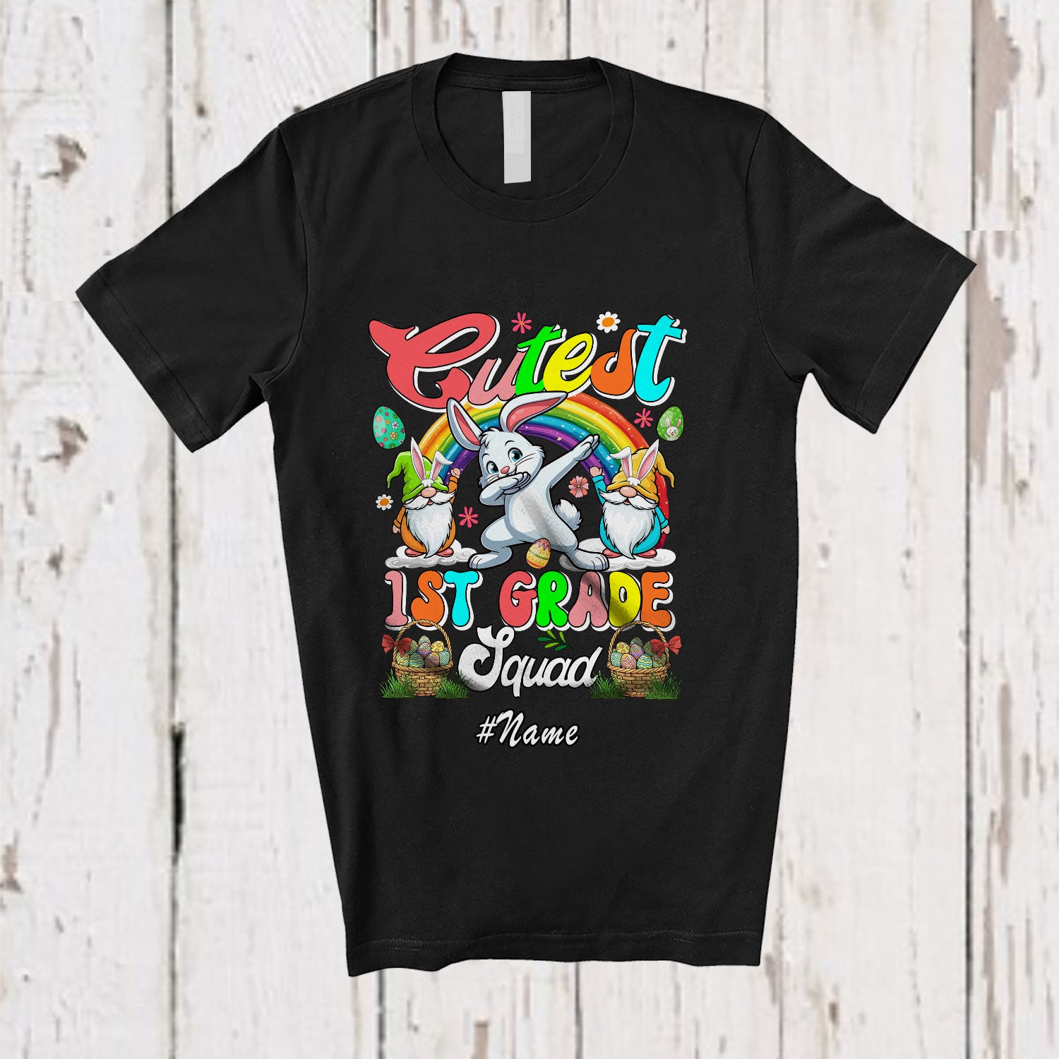 • Personalized Custom Name Cutest 1st Grade; Joyful Easter Rainbow Dabbing Bunny; Students Teacher T-Shirt. This cotton t-shirt is a durable staple product with a classic fit. One of the most popular items, it has a relaxed style made for everyday and casual wear.
