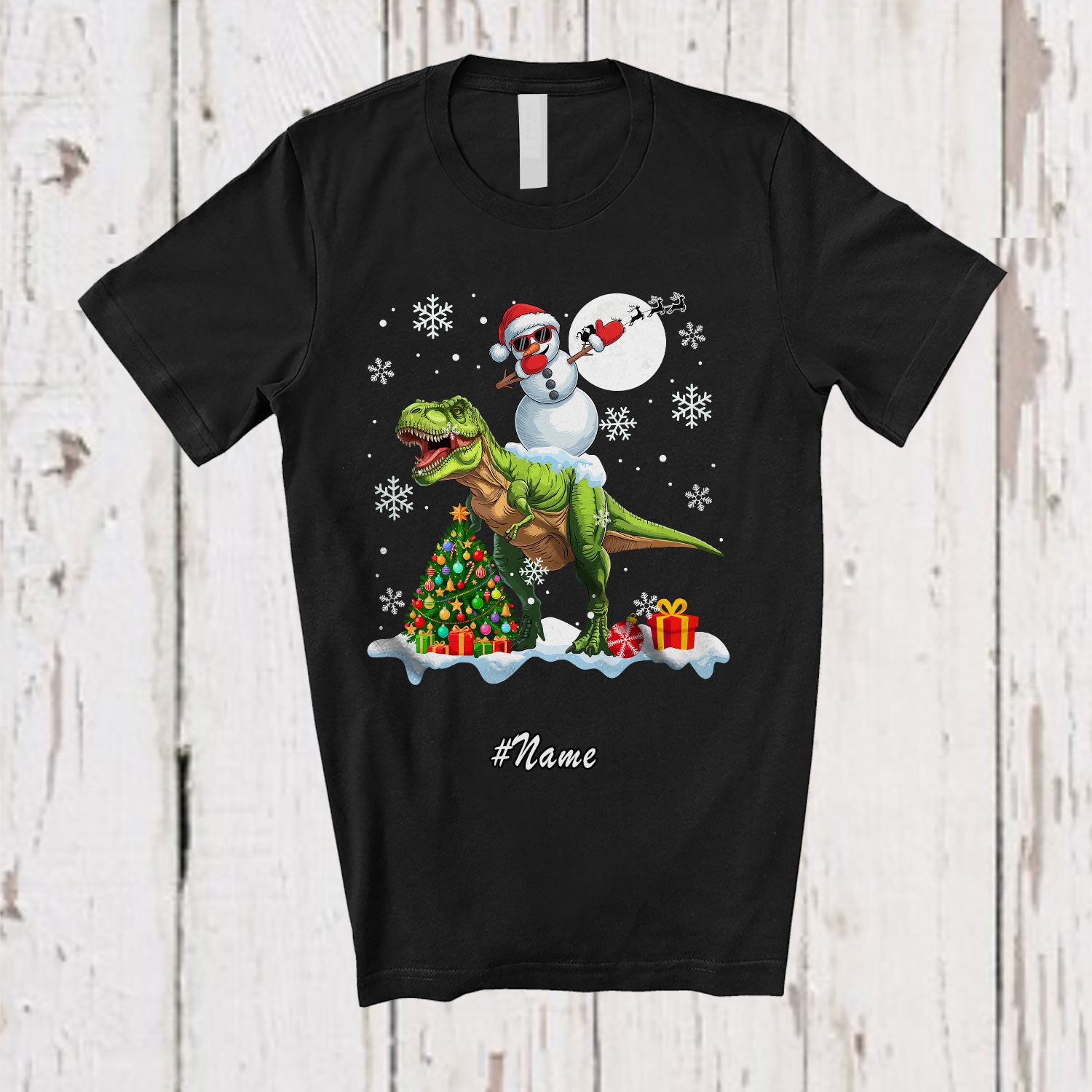 Personalized Custom Name Dabbing Snowman Riding T-Rex; Cheerful Christmas Snow Animal T-Shirt