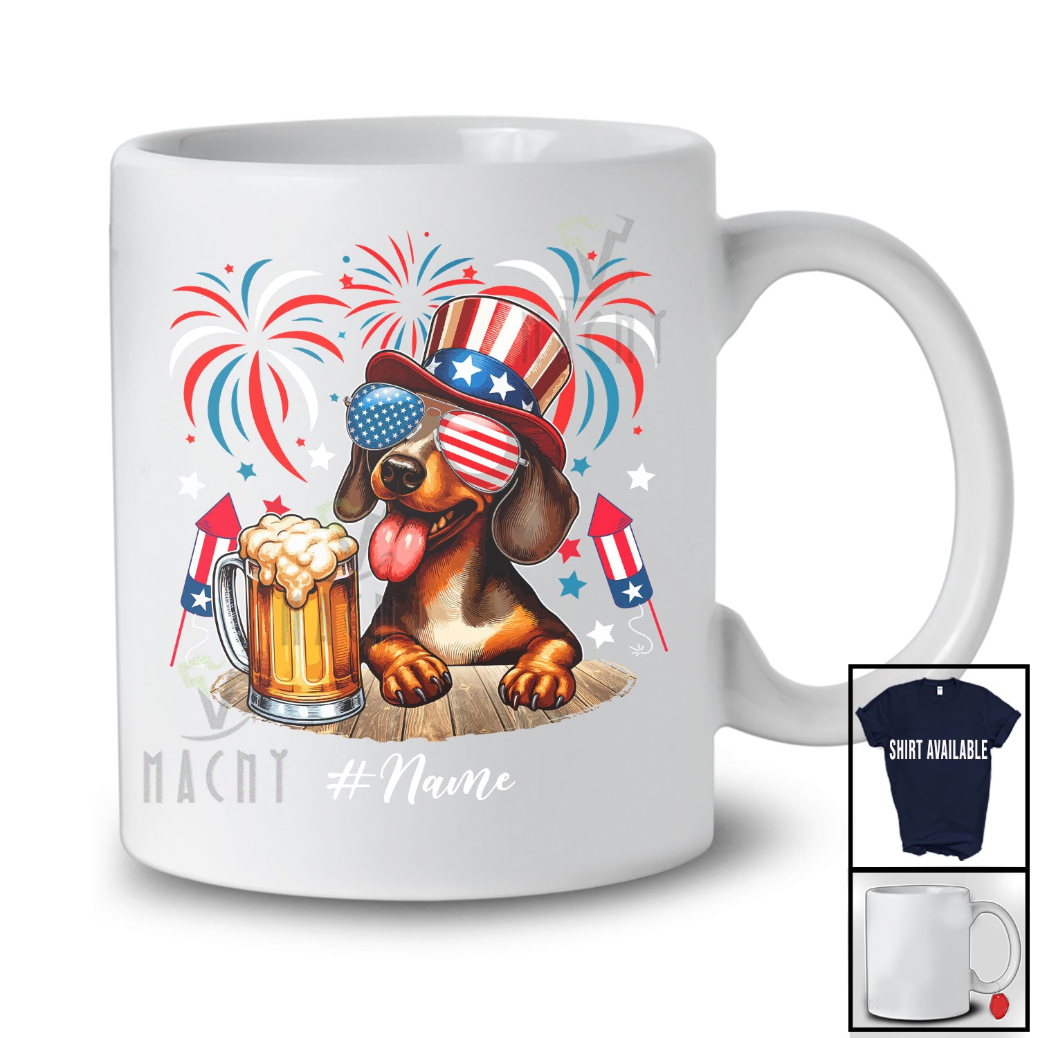 Personalized Custom Name Dachshund Drinking Beer; Amusing 4th Of July Fireworks Patriotic T-Shirt. This cotton t-shirt is a durable staple product with a classic fit. One of the most popular items, it has a relaxed style made for everyday and casual wear.