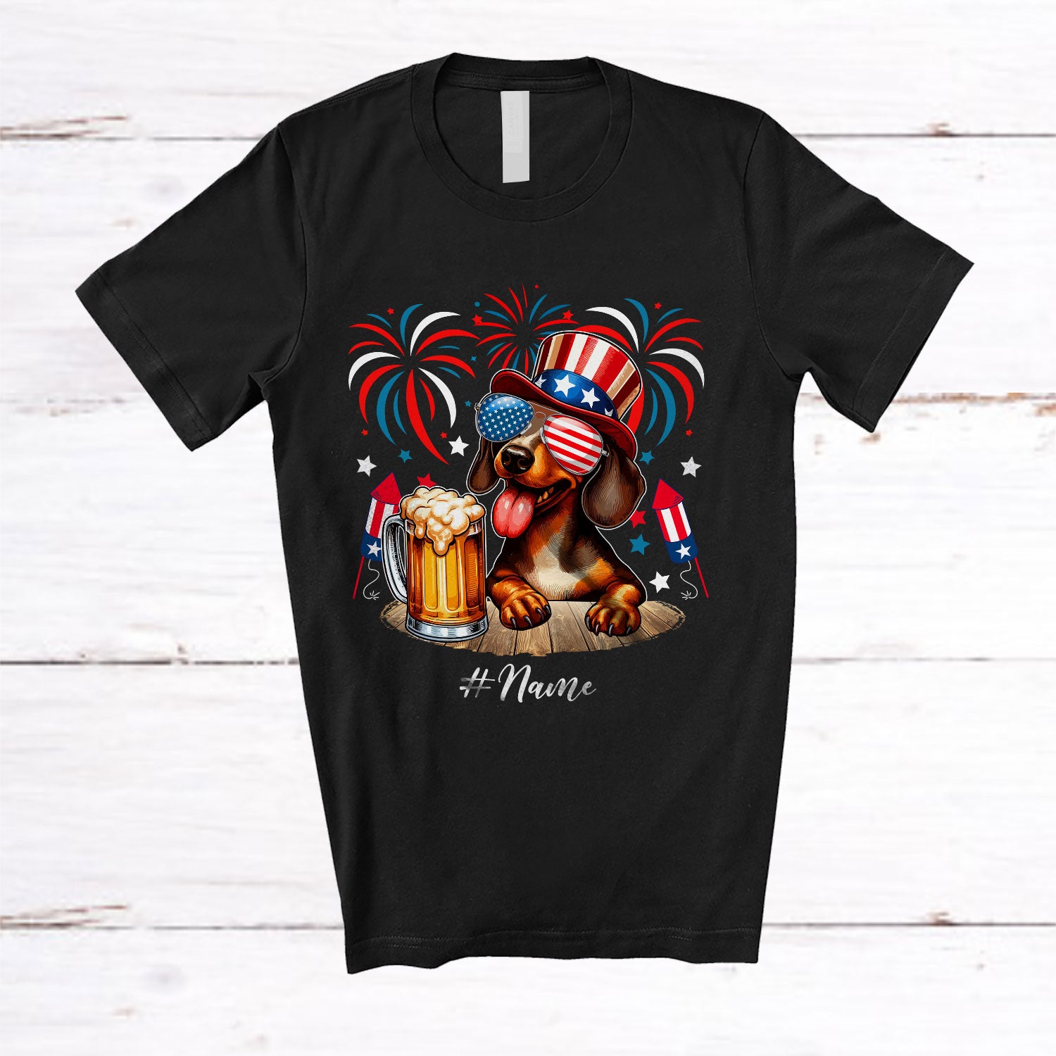 Personalized Custom Name Dachshund Drinking Beer; Amusing 4th Of July Fireworks Patriotic T-Shirt