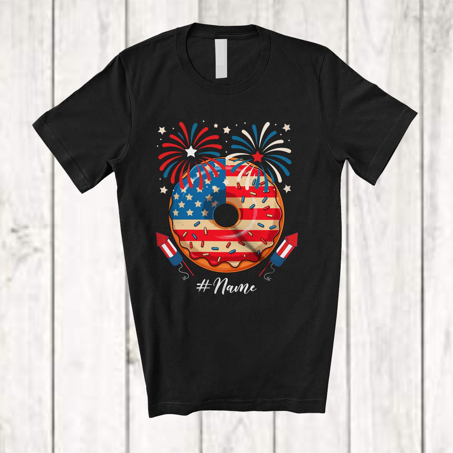 • Personalized Custom Name Donut US Flag Fireworks; Joyful 4th Of July Chef Lunch Lady; Patriotic T-Shirt. This cotton t-shirt is a durable staple product with a classic fit. One of the most popular items, it has a relaxed style made for everyday and casual wear.