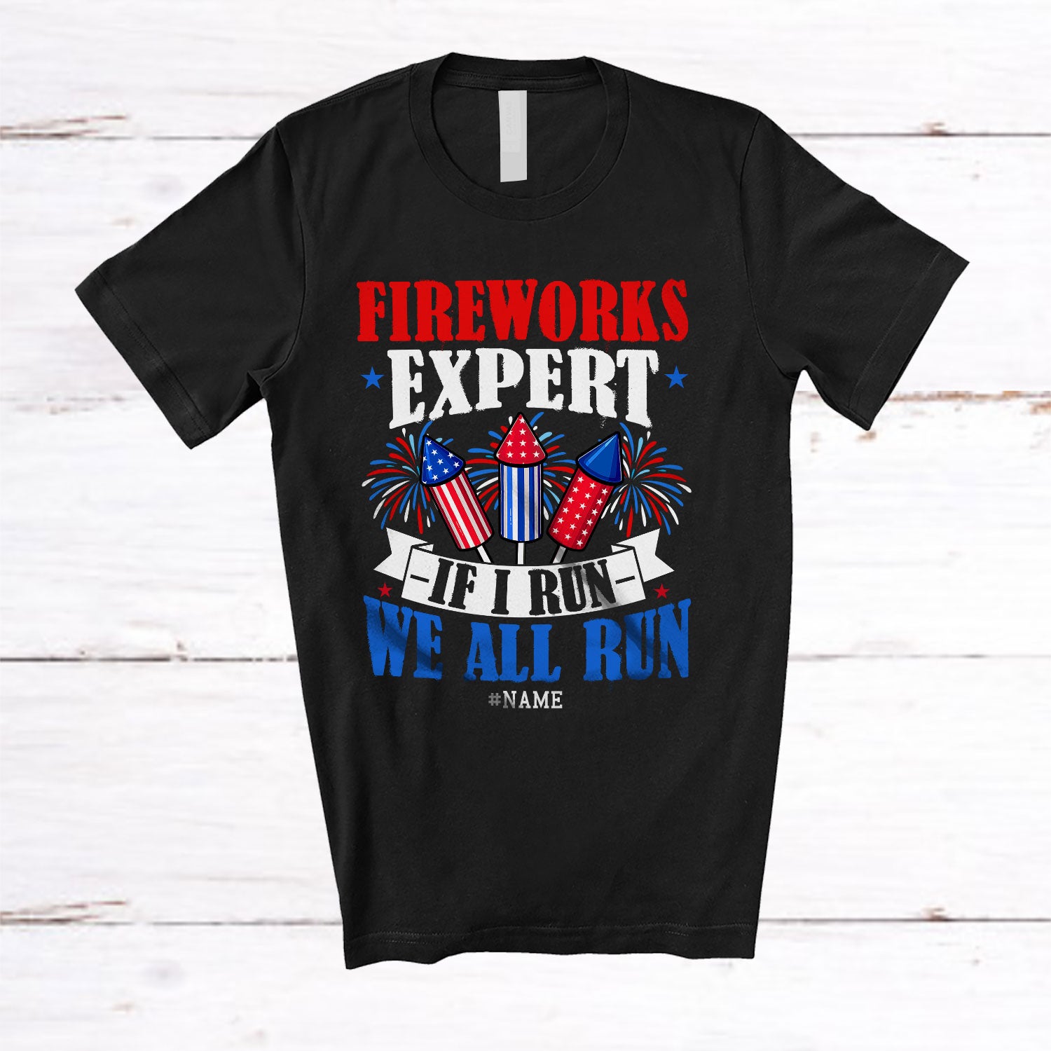 Personalized Custom Name Firework Expert We All Run; Proud 4th Of July Firecrackers; Patriotic T-Shirt