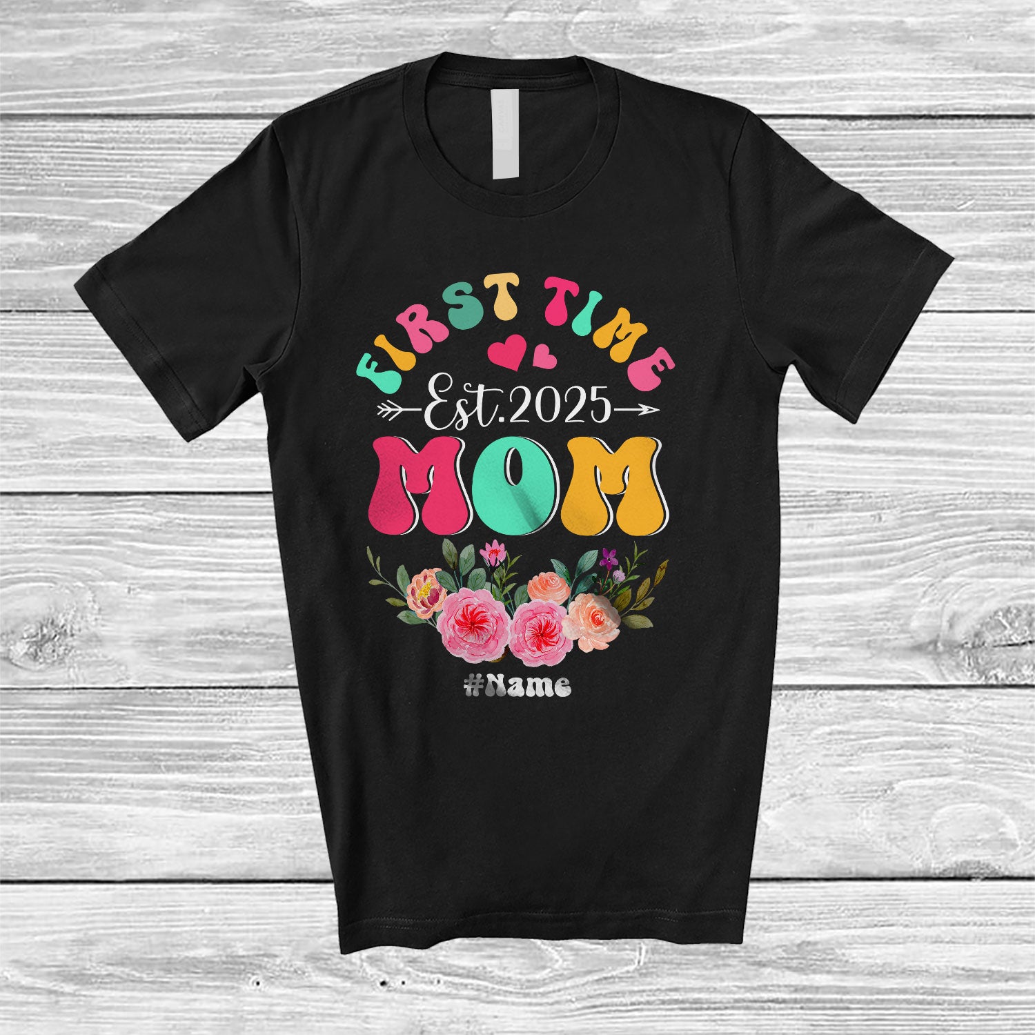 This Personalized Custom Name First Time Mom Est. 2025; Lovely Mother's Day Pregnancy Flowers T-Shirt is great idea gift for your family, friends in this birthday, christmas, mother's day, father's day, patrick's day or any holiday.