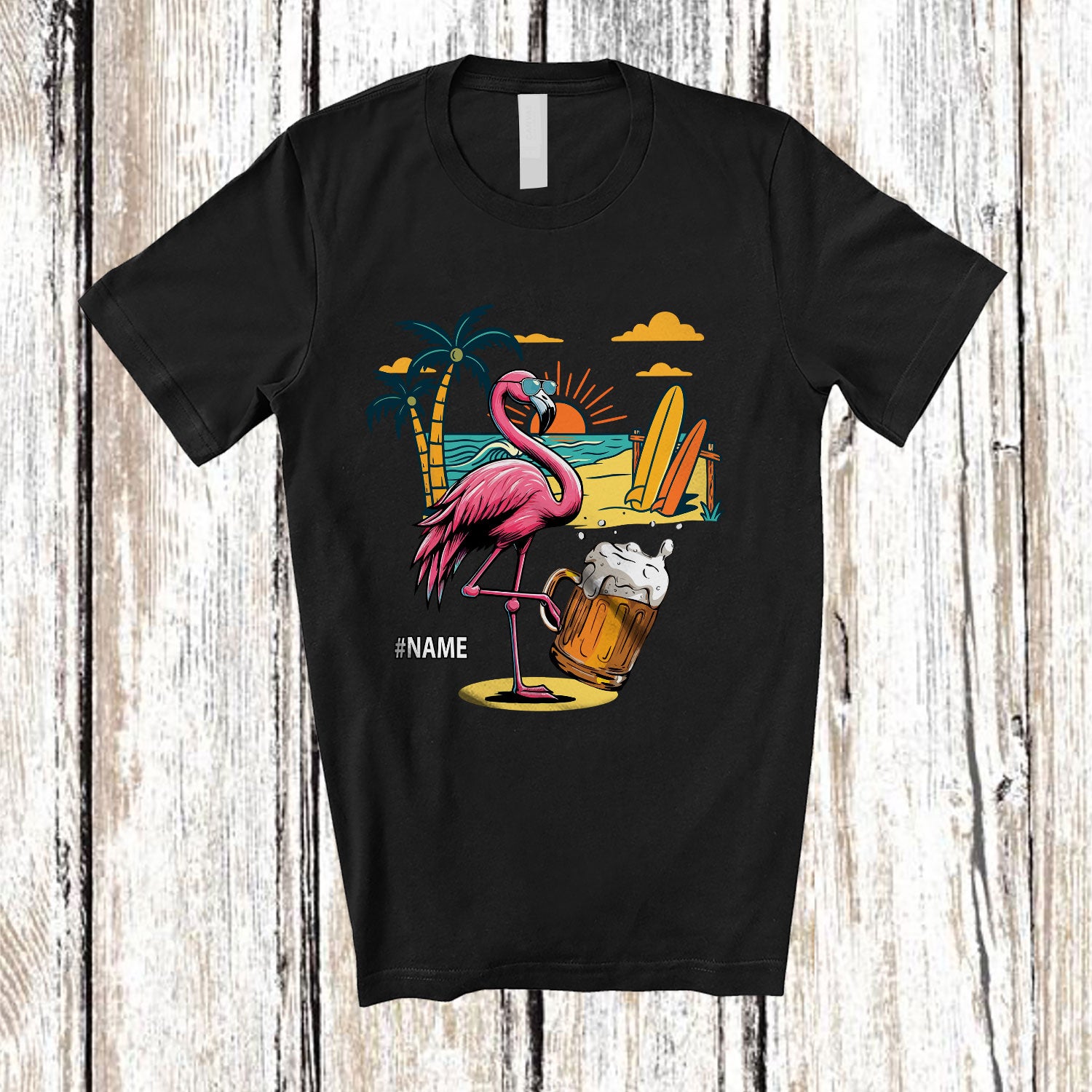 Personalized Custom Name Flamingo Drinking Beer; Cheerful Summer Vacation Alcohol Drunker T-Shirt