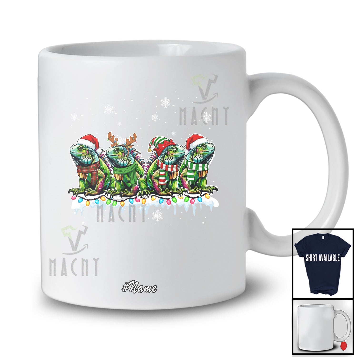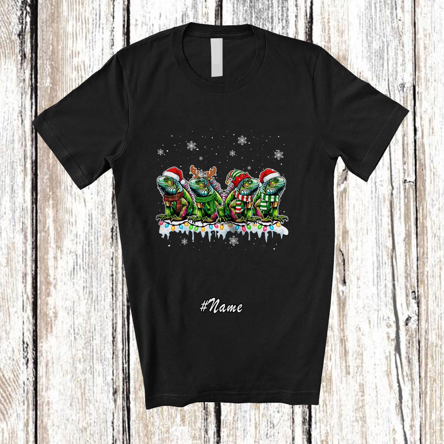 Personalized Custom Name Four Santa Elf Iguanas; Adorable Christmas Lights Iguana Animal T-Shirt