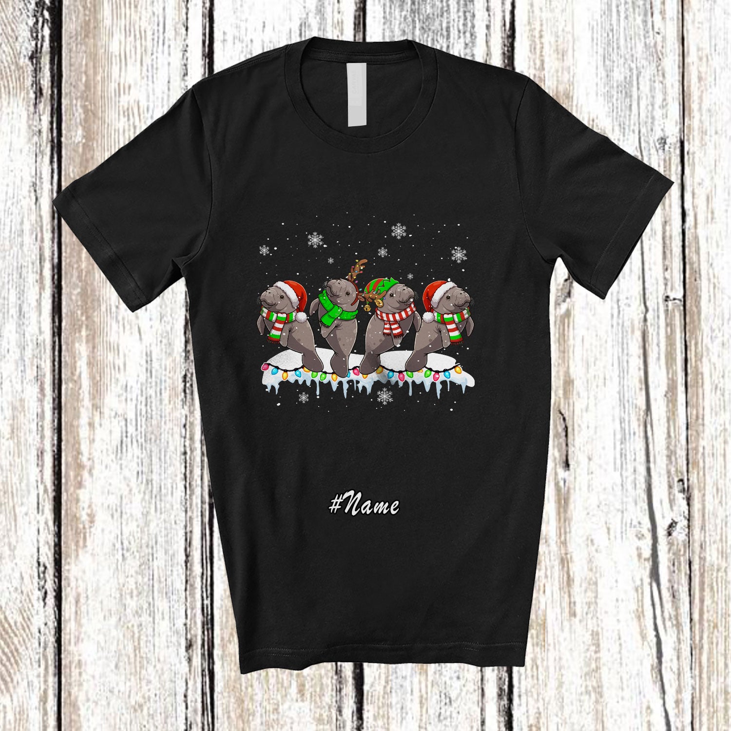 Personalized Custom Name Four Santa Elf Manatee; Adorable Christmas Lights Manatee Animal T-Shirt