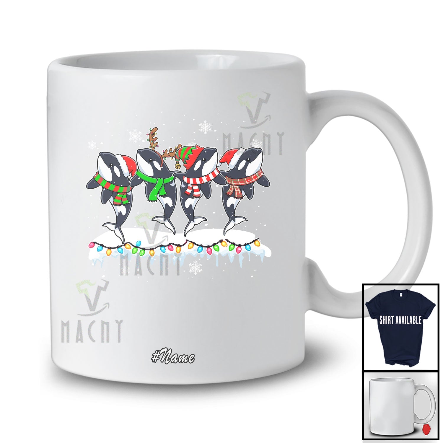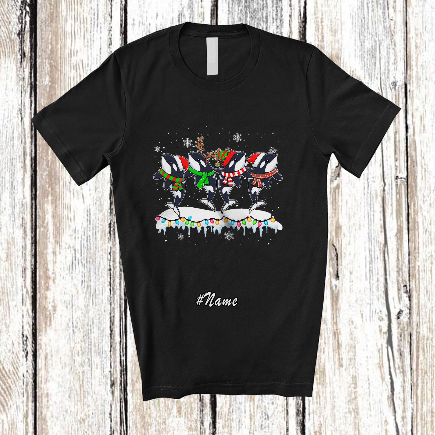 Personalized Custom Name Four Santa Elf Orca; Adorable Christmas Lights Snow Orca Animal T-Shirt