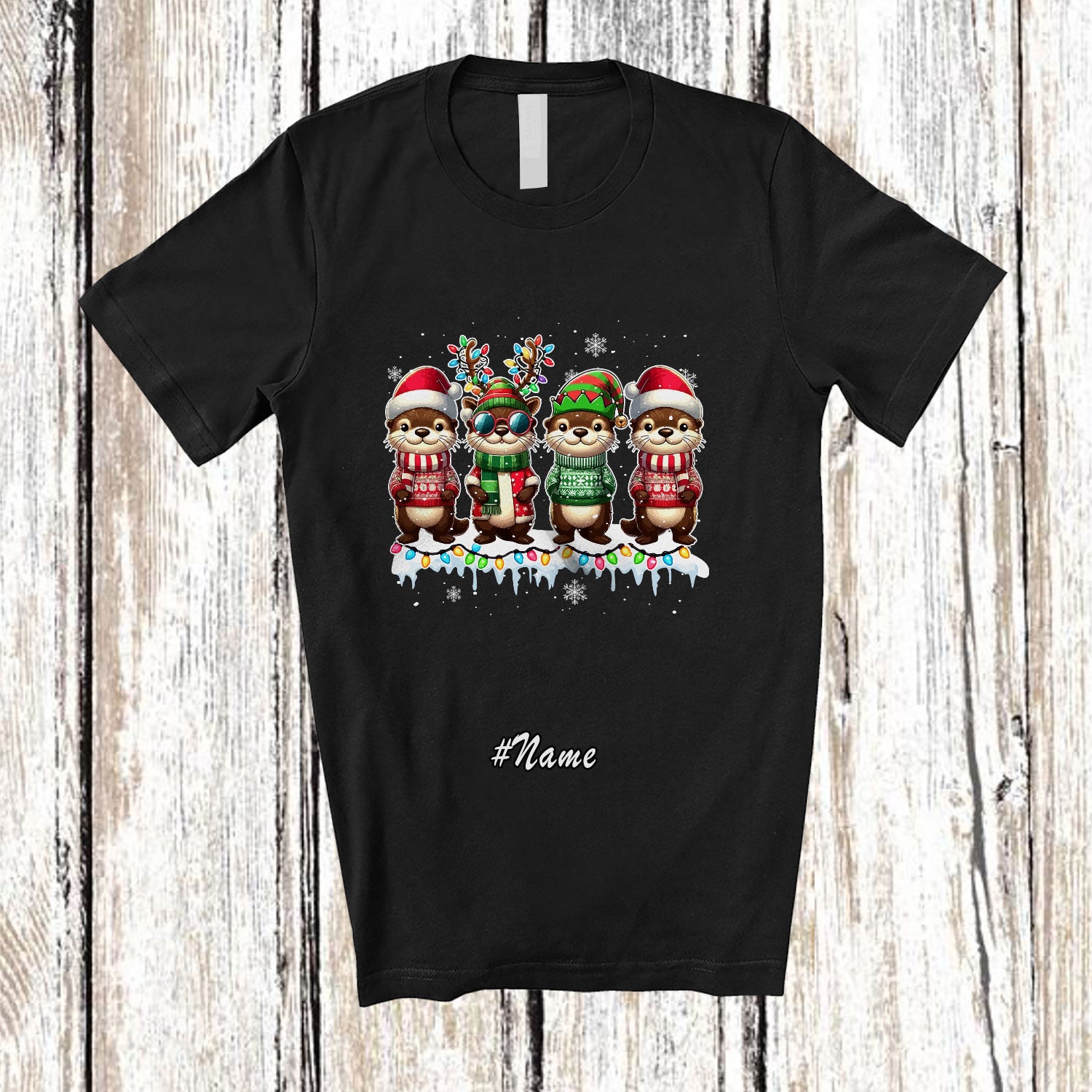 Personalized Custom Name Four Santa Elf Otter; Adorable Christmas Lights Snow Otter Animal T-Shirt. This cotton t-shirt is a durable staple product with a classic fit. One of the most popular items, it has a relaxed style made for everyday and casual wear.